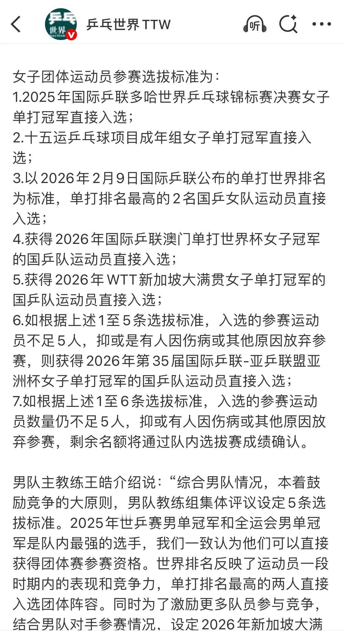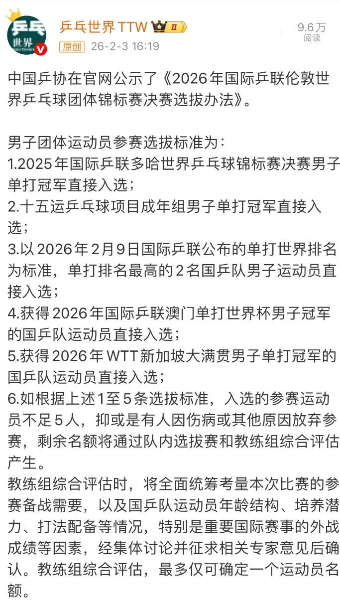 马继华发文:若有战,召必回! 今天乒乓球圈最大消息之一, 中国乒协公布了2026伦敦世乒赛 团体选拔办法, 樊振东因为是第15届全运会男单冠军,直接入选伦敦世乒赛! 马继华发文, 若有战,召必回! 樊振东这次也是左右为难, 不去的话,万一国乒输了, 挨骂的一定是樊振东, 但是,去不去也不是樊振东决定的, 参赛,就是不给年轻人机会, 不给他们一单二分成长的机会, 参赛与不参赛都难, 世乒赛单打不知道给樊振东名额吗? 但相信, 只要乒协说一句, 国家需要你, 相信樊振东会回来的! 即使单打不参赛, 团体去兜底!