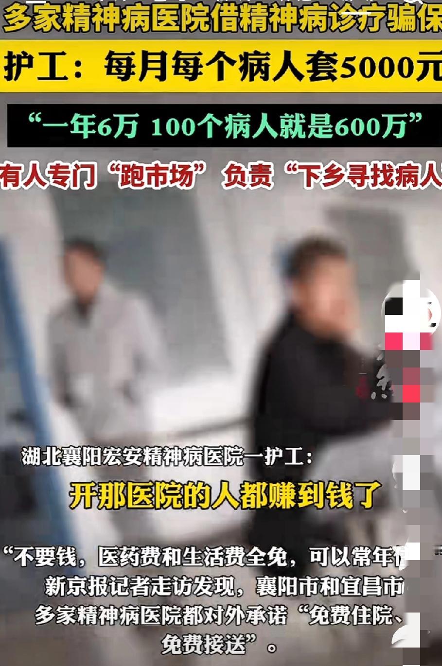 “不要钱,医药费生活费全免”每月每个病人套5千元,多家精神病医院借精神病诊疗骗保!医保救命钱谁来守护? 近日,湖北襄阳、宜昌多家精神病医院惊天骗保黑幕曝光,每月从每名住院患者身上套取医保资金5000元,以免费住院为诱饵,诱骗正常人、轻症患者及老人入院,入院易出院难,打骂捆绑更是常态,甚至有人因要求出院被拒绝后而绝望自杀,医保救命钱沦为黑心机构敛财工具,引发全网愤慨。 涉事医院多为民营机构,为疯狂套保,打出免费住院、免费接送、吃住全免旗号,甚至派员工下乡扫村揽客,紧盯孤寡老人、有家庭矛盾者及单纯戒酒人群,大肆扩张“客源”。更离谱的是,医院公然虚构病历,将无精神疾病的正常人诊断为精神障碍,连本院护工、保安都被办理住院手续装病,只为多占医保名额,一人住院每月就能为医院创收5000元医保金。 一旦入院,患者便坠入牢笼。院方即刻没收手机、切断通讯,对外谎称患者病情不稳定,彻底阻断其求助渠道,入院容易出院难成常态。轻症患者康复后仍被强制滞留数年,有人甚至被关押八九年,医院为了规避医保检查,还定期安排患者假出院,上演躲猫猫戏码,只为长期套保牟利。 目前,襄阳、宜昌已成立联合专项调查组,对辖区精神病院开展起底式排查,涉事医院被责令停业整顿,相关负责人被约谈控制,全额追缴被套取医保资金,依法从严追责,专项举报通道同步开通,彻查骗保产业链条。 医保本是百姓们的救命钱,每月每个病人5000元,一年就是6万,100个病人就是600万!这笔庞大的资金将会影响多少百姓救命!精神病院本是守护特殊群体的疗愈之地,却沦为敛财魔窟,简直是利欲熏心,丧尽天良!希望调查组能够严查相关机构,严惩相关责任人,全额追缴赃款,同时健全医保智能监控、完善入院审核机制,堵住监管漏洞,才能守住医保红线,还医疗行业清朗,让弱势群体免于迫害,让救命钱真正用在刀刃上。