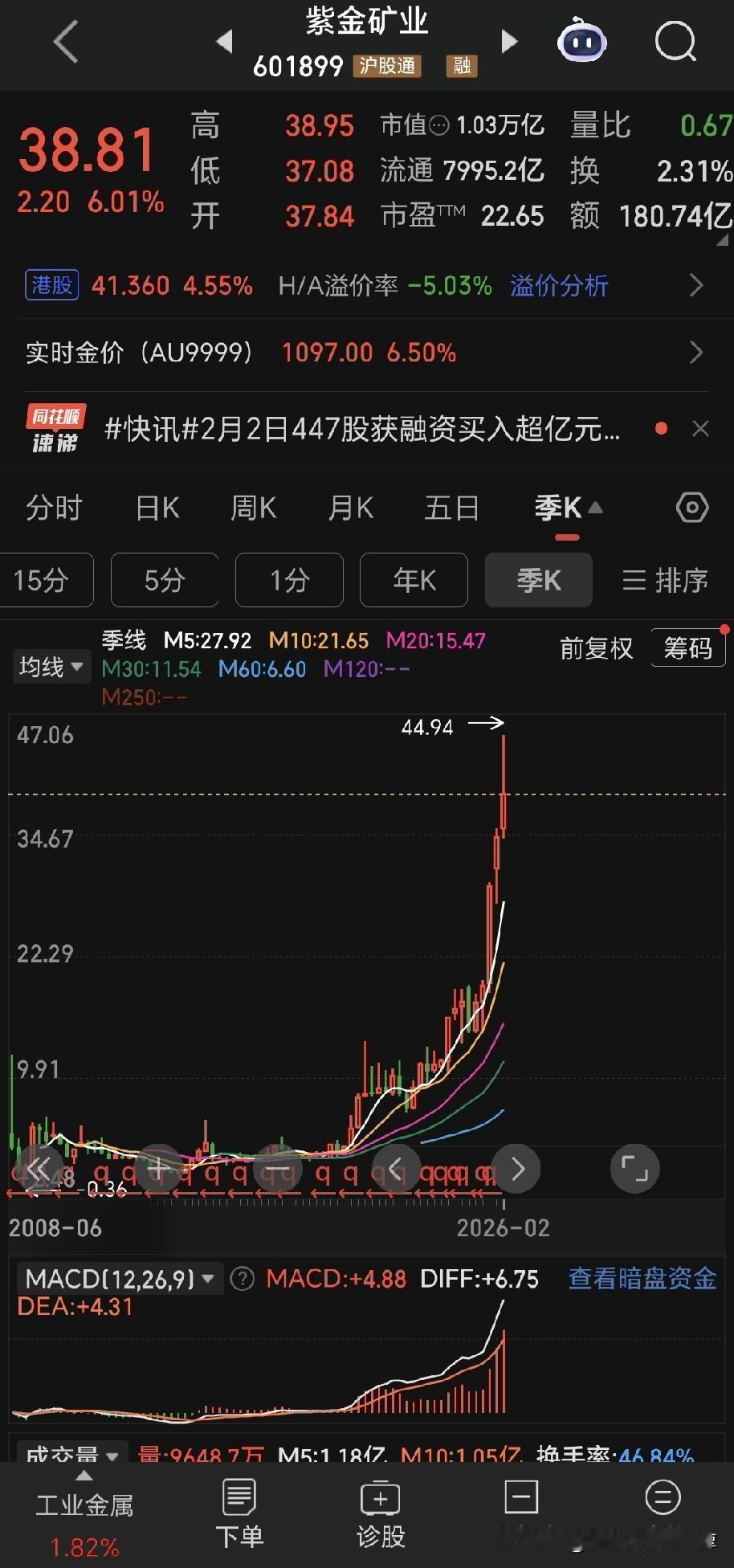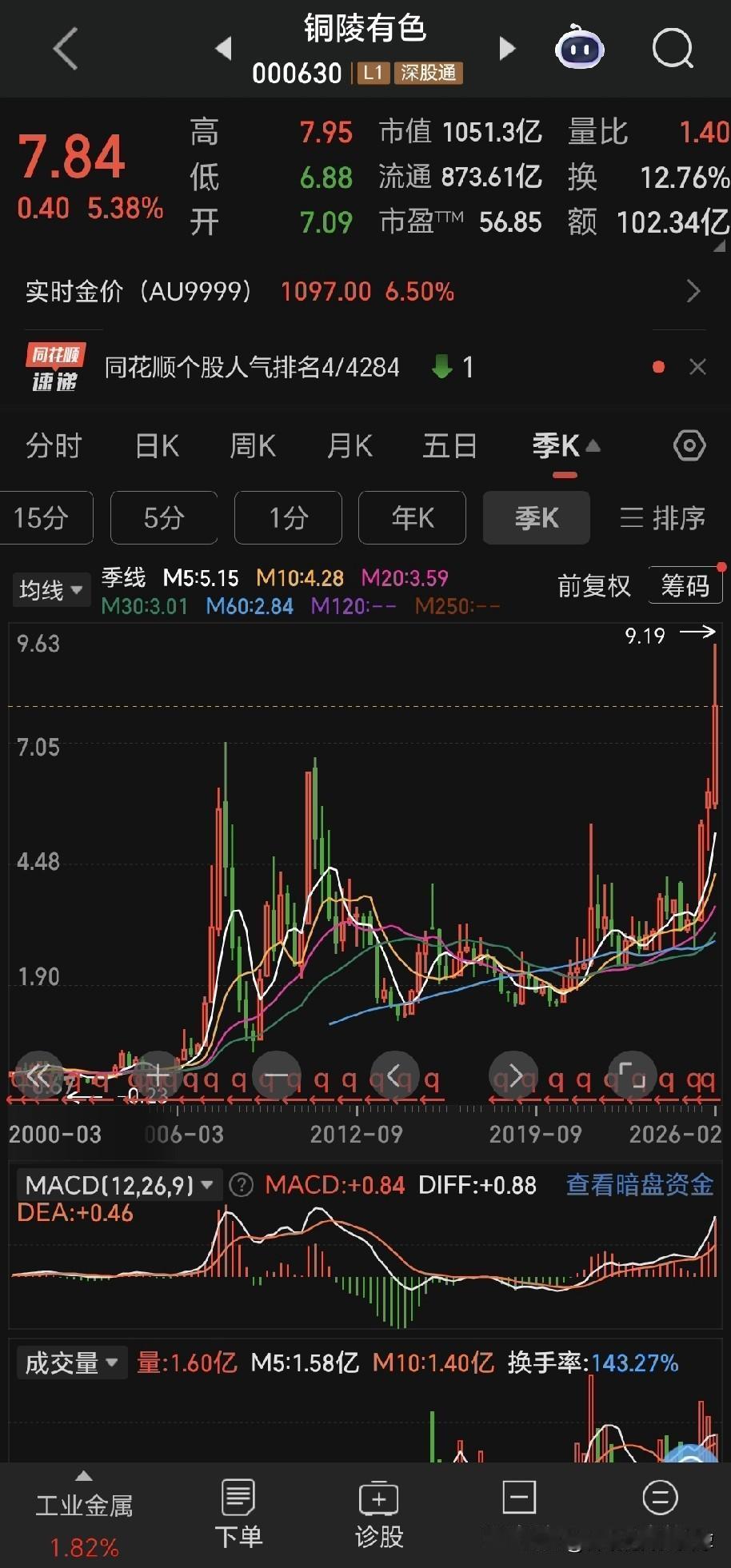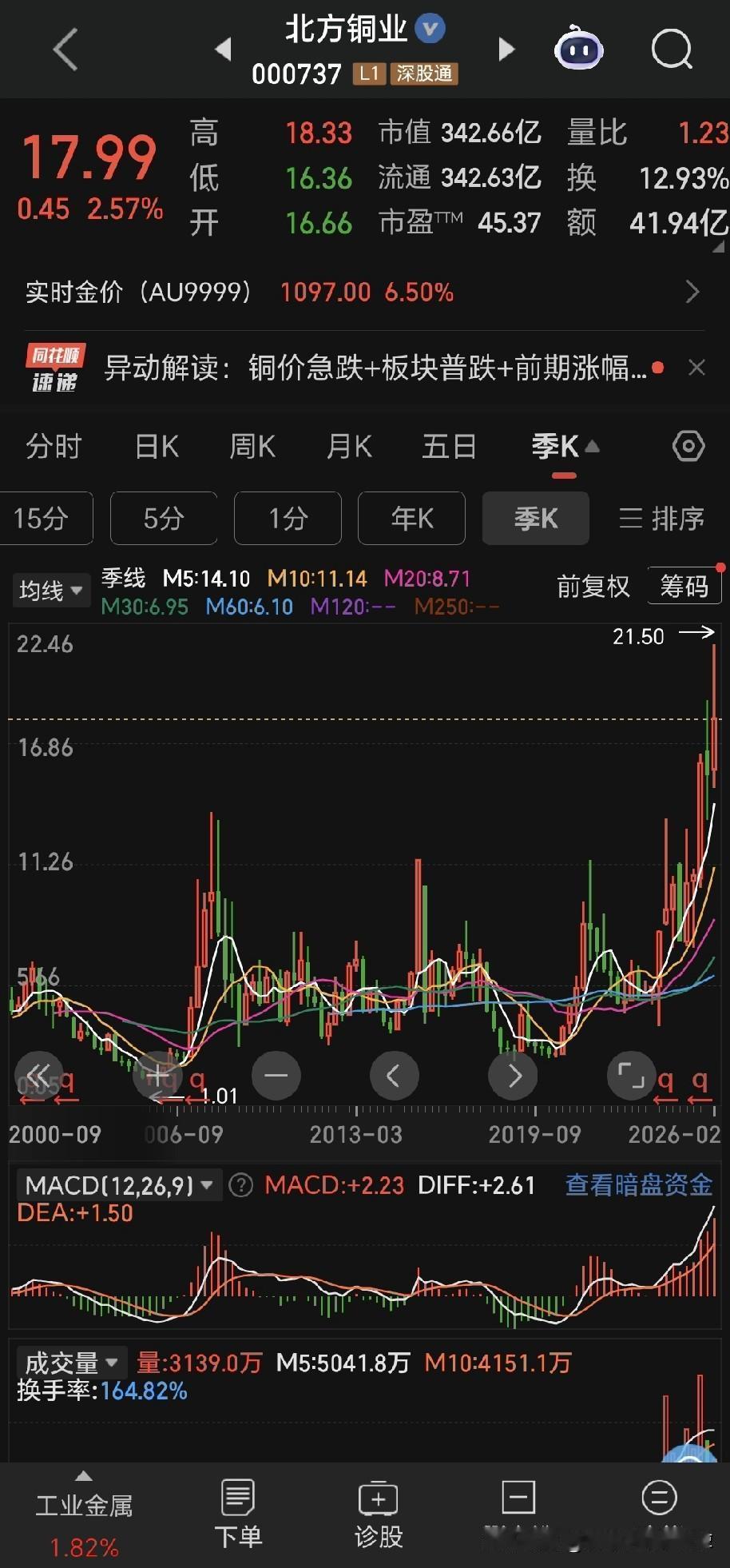 伦敦金现在已经反弹了五个点以上,目前接近5000大关。盛达资源下午打开跌停,最麻烦的白银和白银股现在也要止跌企稳。 翻看了有色股票,云南铜业在这里面涨的算是晚的,现在也就在历史峰值的1/4位置,江西铜业已经接近新高,西部矿业虽然没有新高,但是从底部上来也已经涨了很多,其他品种像北方稀土、紫金矿业、北方铜业、铜陵有色、洛阳钼业、山东黄金等等,早就已经创了新高,在持续新高的途中。 这种情况首先说明云南铜业自身还是比较弱的,这个事情先要承认,其次就是希望这个行情能够纵深的再发展一段时间,给云南铜业一个表现的机会,与此同时,我们现在需要做做一步的打算,筛选未来的目标品种。 贵州茅台,有可能在这里构筑一个小的,底部,但是我还是觉得消费股的周期轮转还没有到来,现在或许可以播种,但是不是适合大仓位播种?我还是觉得不太有比较优势 就是说相对于现在的市场氛围来说,可能要考虑一下机会成本。