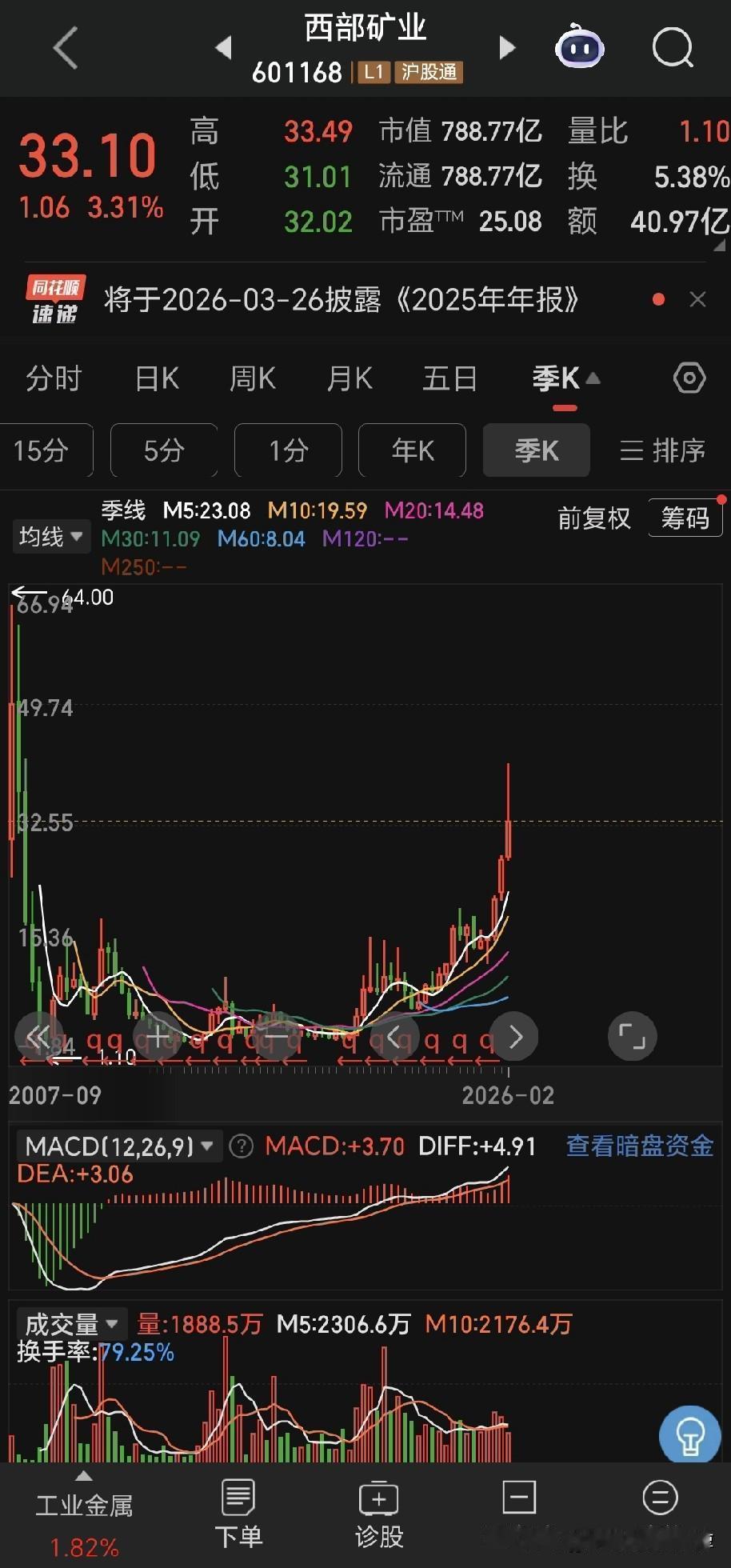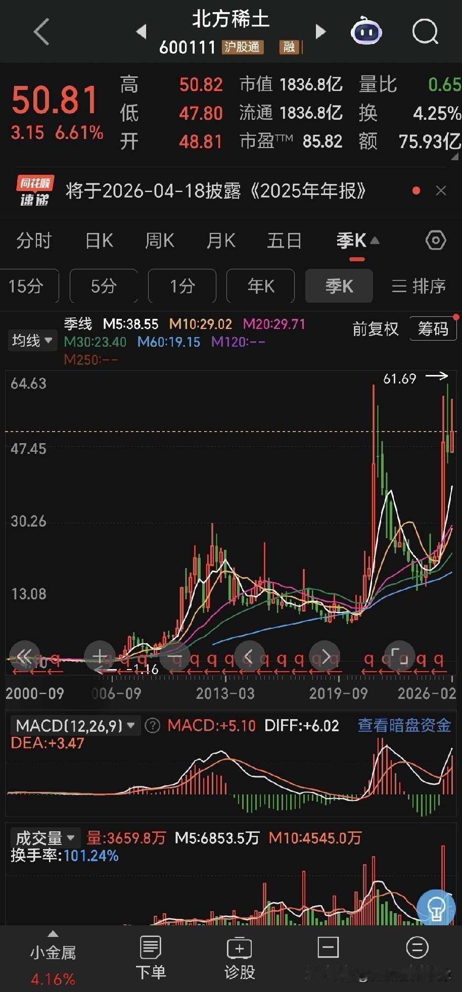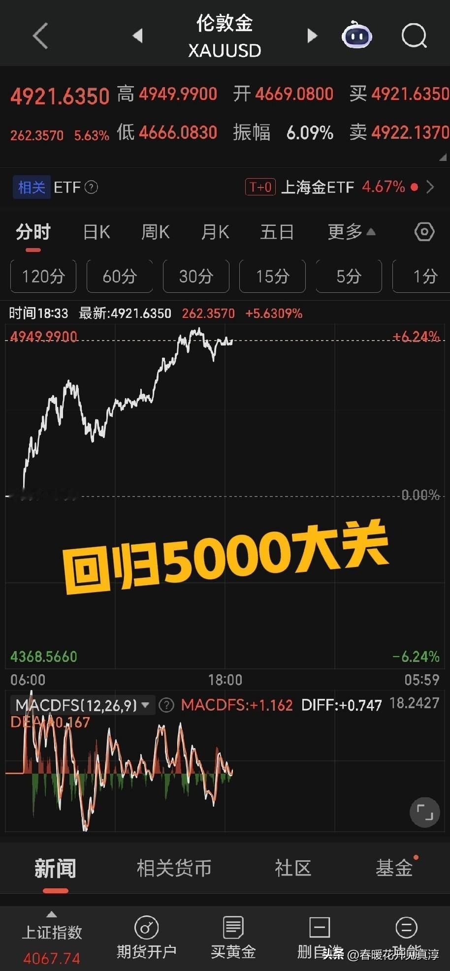 伦敦金现在已经反弹了五个点以上,目前接近5000大关。盛达资源下午打开跌停,最麻烦的白银和白银股现在也要止跌企稳。 翻看了有色股票,云南铜业在这里面涨的算是晚的,现在也就在历史峰值的1/4位置,江西铜业已经接近新高,西部矿业虽然没有新高,但是从底部上来也已经涨了很多,其他品种像北方稀土、紫金矿业、北方铜业、铜陵有色、洛阳钼业、山东黄金等等,早就已经创了新高,在持续新高的途中。 这种情况首先说明云南铜业自身还是比较弱的,这个事情先要承认,其次就是希望这个行情能够纵深的再发展一段时间,给云南铜业一个表现的机会,与此同时,我们现在需要做做一步的打算,筛选未来的目标品种。 贵州茅台,有可能在这里构筑一个小的,底部,但是我还是觉得消费股的周期轮转还没有到来,现在或许可以播种,但是不是适合大仓位播种?我还是觉得不太有比较优势 就是说相对于现在的市场氛围来说,可能要考虑一下机会成本。