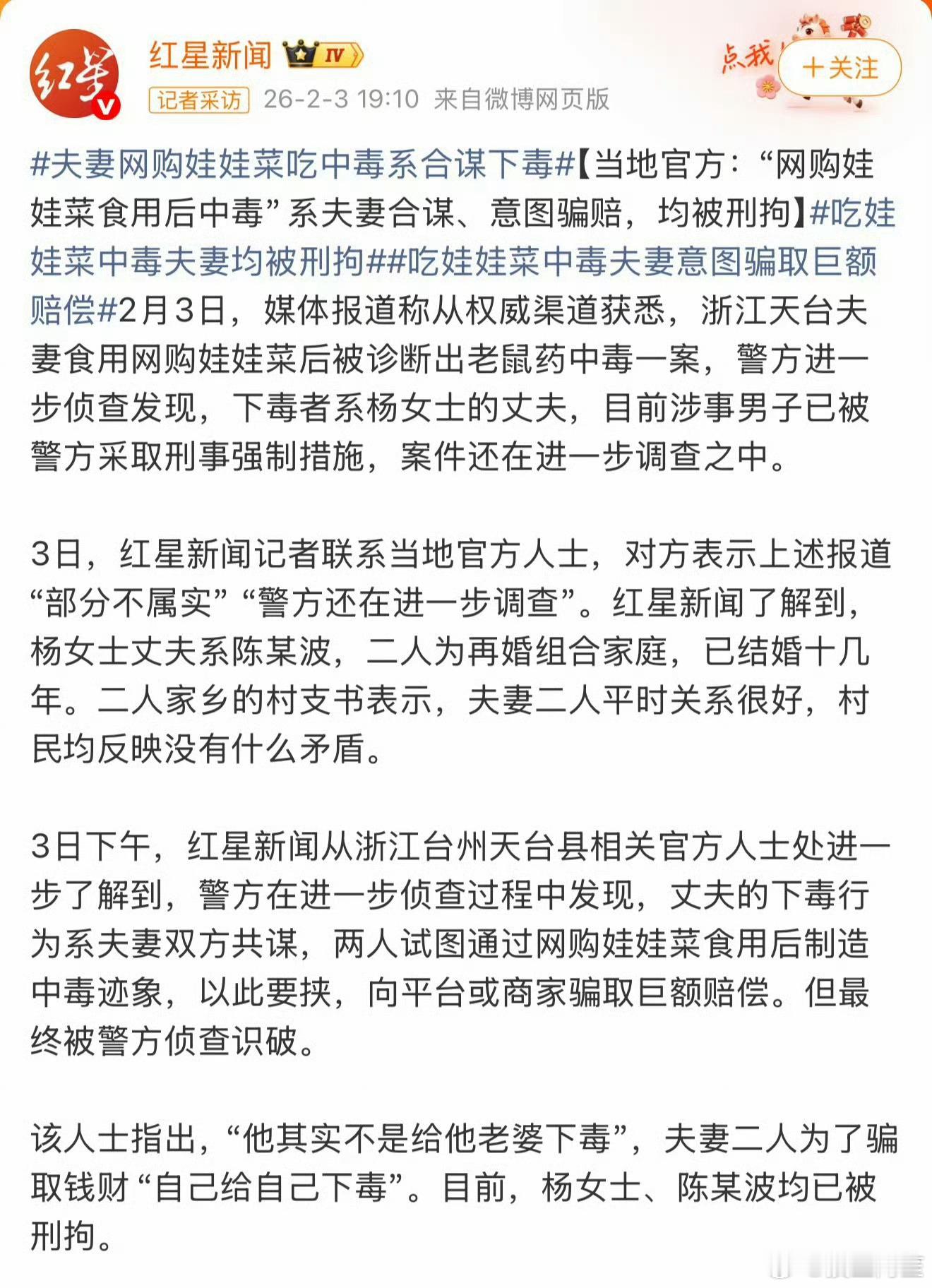 这件事已经反转3次4个说法了……我现在觉得是媒体需要给我们观众一个说法,玩呢警方辟谣夫妻网购娃娃菜中毒系丈夫下毒