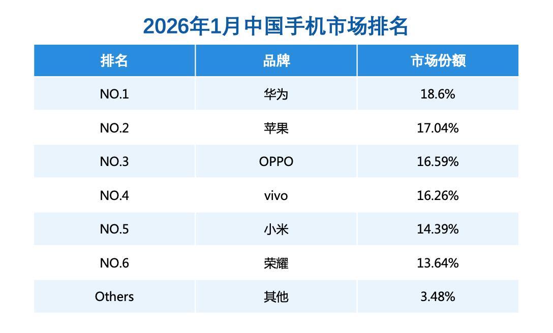 2月1日,根据权威第三方销量数据(Sell out), 华为领跑新年手机市场份额提升至18.6% 华为再夺1月中国手机市场份额第一 根据数码博主RD观察 公布的统计数据,截至2026年1月底,华为Mate80系列销量约254.32万,超越Mate70同期,市场表现强劲。华为还在1月开启了春节限时优惠,部分手机最高降价2000元,带动多款产品热销,市场反响热烈。