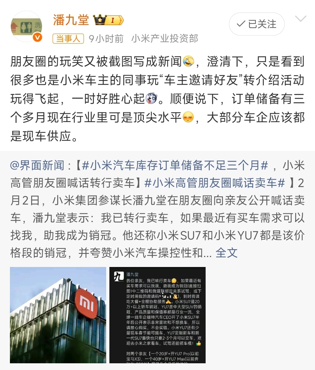 小米高管回应喊话转行卖车开个玩笑而已,不要当真!订单储备有三个多月现在行业里可是顶尖水平!
