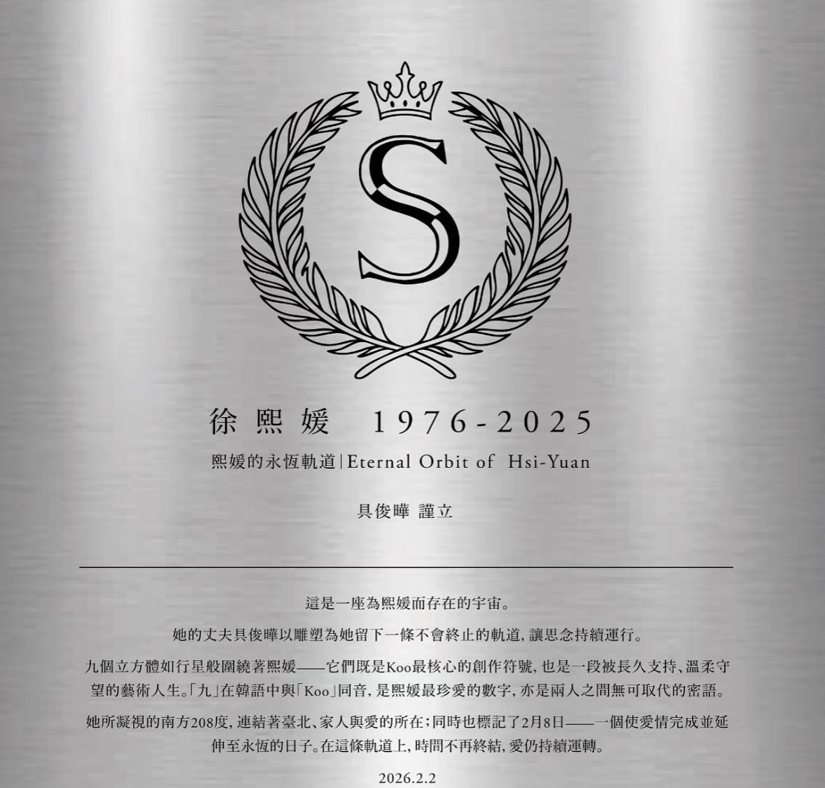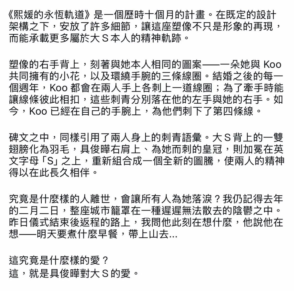 难怪小S看到大S纪念雕像的第一反应是摸摸姐姐的手,原来那上面刻着大S同款花朵刺青,那是她17岁时的青春和叛逆,后来,具俊晔也在手上刺了同款。 尽管大S已经离世,但具俊晔与大S约好的,每个结婚周年,都要在手腕上刺一条线的恩爱行动仍在进行。2025年,大S带着三条线永远的走了,2026年,具俊晔的手腕上多了第四条。为了让这条线能在牵手时相扣,刺青落在他的左手和她的右手,有点幼稚,但爱情好像本就幼稚。 纪念雕像揭幕现场,大S母亲哭到不能自已,转身与具俊晔拥抱获取安慰,小S则摸了摸姐姐的手,指了指那朵能够代表大S的,17岁就存在的刺青。 大家都还记得大S,就好像,她从未离开。