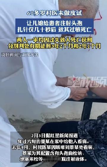 找熟人看病竟然丧命!山西六旬村医非法行医,不做皮试就用了头孢致患者身亡! 2025年1月,山西襄垣县发生了一起医疗事故,六旬村医景某,早年取得乡村医生证,60岁后执业证没有换证,却仍在家中私自接诊村民,靠每月500余元购药为乡邻看病,村民陈某及其家人曾多次上门就诊,对其十分信任。 当月16日,陈某因浑身疼痛、咳嗽,再次到景某家中求医,提出输液治疗并希望带回家输注。景某并没有3依规问诊过敏史、核查基础疾病,仅凭个人经验,为陈某配置含头孢曲松钠、地塞米松的三瓶输液药液,随后安排儿媳崔某上门为陈某扎针输液。 崔某虽为医疗卫生专业毕业生,却明知药品来源不正规、患者家中无任何急救设备,且未按诊疗规范为陈某做头孢皮试,便直接注射药液。令人猝不及防的是,注射头孢药液仅几十秒,陈某就突发呕吐、胸闷等过敏症状,崔某当即拔针,紧急采取心肺复苏、人工呼吸等急救措施,同时拨打120求救,遗憾的是,陈某最终因药物过敏性休克抢救无效死亡。 最终,襄垣县人民法院一审以过失致人死亡罪,考量二人自首、认罪认罚,且景某年逾六旬等情节,判处景某有期徒刑3年2个月,崔某有期徒刑2年1个月。 行医无小事,人命大于天。头孢用药更应该严格遵循医疗规则使用,皮试不能忽略,每一次的医疗操作,都关系着患者的生命健康,容不得半点马虎。在医疗行业,规则就是生命线,是无数前人用经验和教训总结出来的保障。
