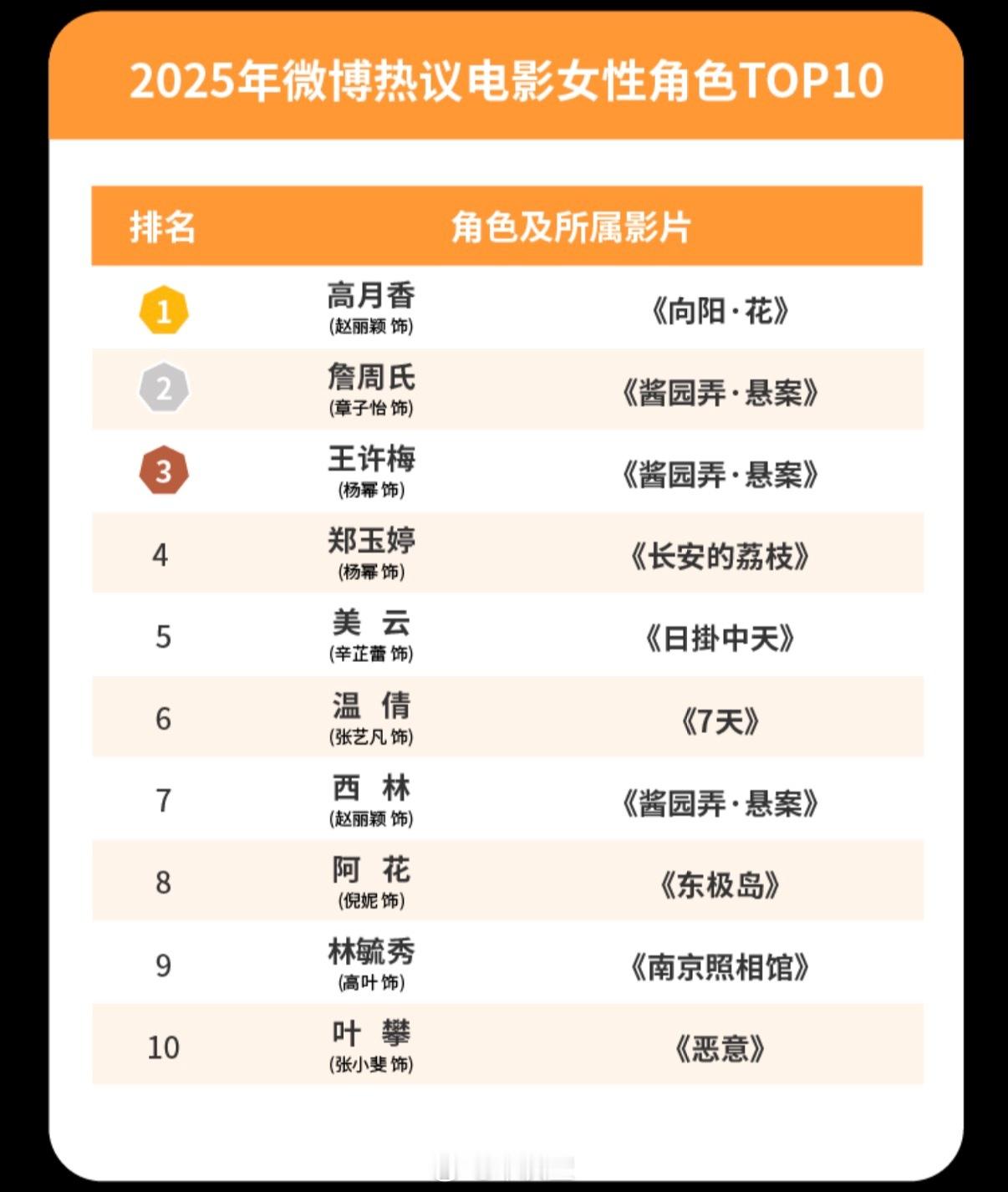 这个微博热议电影角色Top10也可以当作百花奖的一个参考吧,作为人气方面。微博娱