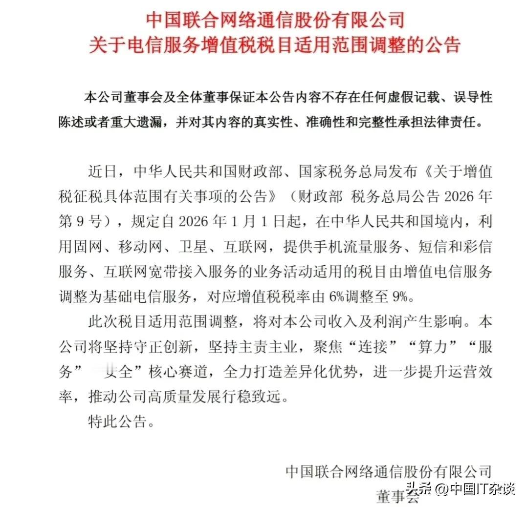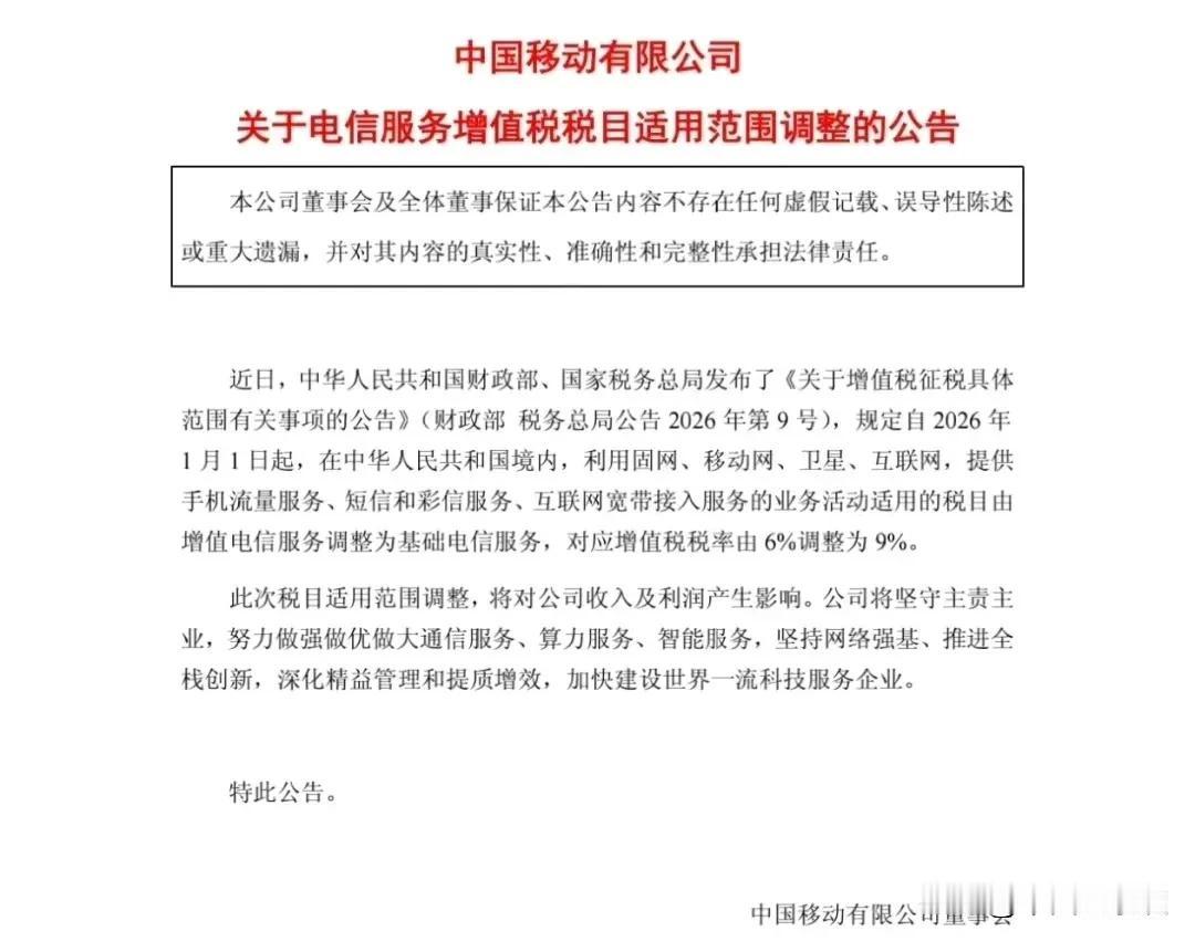 移动电信联通同时公告:电信服务增值税税目适用范围调整,业务服务税率由6%上调到9%。除了三家运营商股价因此震荡、运营商因此有可能利润降低以外,对通信消费者或客户的影响有待观察。