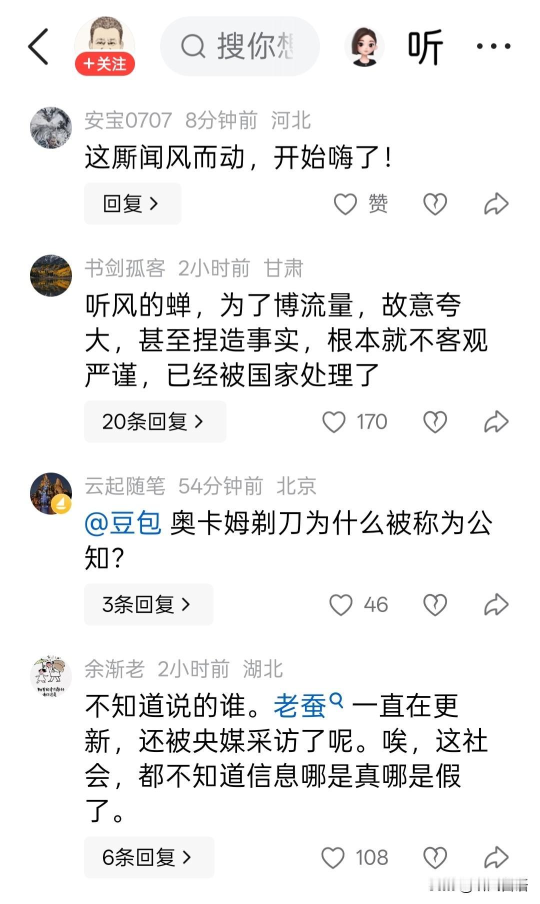 听风的蚕粉丝被大量清理,有人开始幸灾乐祸了! 这个"剃刀"博主虽然没有点名听风的蚕,但是一看就知道是在说谁了。还有点得意洋洋,说自己经历过太多次的网络风浪,每次都能屹立不倒,平安无事。 哎,让我想起蚕哥以前说过的一句话:"同行是冤家"! 目前暂时没有官方出来澄清具体原因。我们应该静静等待,而不是落井下石,幸灾乐祸! 看看网友在"剃刀"下的评论,就知道风向了,也知道和蚕哥相比,谁才更受大家喜爱!