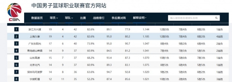 CBA联赛第一阶段赛事全部结束,上海男篮以19胜4负,积42分暂列联赛第二。