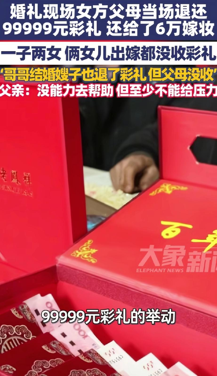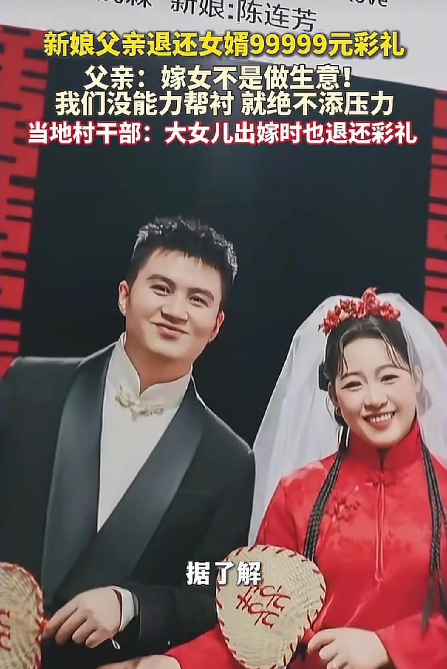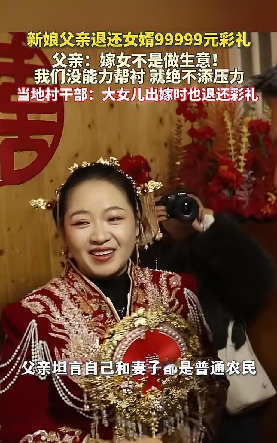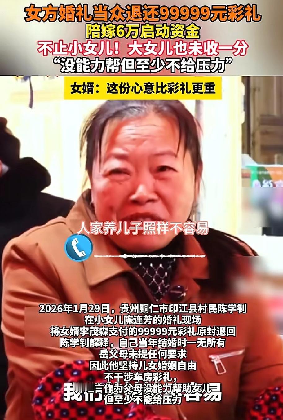 羡慕哭了!贵州,一对新人婚礼现场,女方父母当着所有亲友的面,把男方送来的99999元彩礼全额退还,还送上祝福,网友直呼“太开明,是神仙父母”! 这对新人都是普通家庭,筹备婚礼时,男方按照当地习俗,准备了99999元彩礼,寓意“长长久久”,真心实意想给女方父母一个交代。女方父母一开始就跟女儿说,彩礼就是个形式,他们根本没想过要留。 到了婚礼当天,在所有宾客的见证下,女方父母拿着装着彩礼的红包走上台,不仅把99999元一分不少地还给小两口,还笑着说:“我们嫁女儿不是卖女儿,彩礼只是心意,你们年轻人刚组建家庭不容易,这笔钱留给你们过日子、创业都好,只要你们互相珍惜、好好生活,比什么都强!” 就如网友说的这才是真正为女儿着想的父母,多通透。” 而当地政府也倡导文明婚礼,提倡彩礼不超过6万元。 说实话,我特别佩服这位父亲。他退掉的何止是几万块钱?他退掉的是可能压垮小两口的债务,是未来亲家之间可能产生的矛盾,更是那种把婚姻当买卖的旧观念。 他心里装着的不是“别人家收了多少”,而是女儿婚后能不能轻松、幸福地过日子。这份深沉的父爱,比任何彩礼都贵重! 想想看,现在有些地方彩礼层层加码,好像钱要得越多女儿就越金贵。结果呢?不少有情人在彩礼这道坎上吵翻了脸,甚至婚事告吹。 婚姻的基础什么时候变成讨价还价了? 真正为子女好的父母,都想办法为小家庭“减负”,而不是“加码”。 婚姻的幸福,从来不是用彩礼的厚度来衡量的。父母最深的爱,是帮助孩子轻松启程,而不是给他们背上沉重的包袱。 为这样的好父亲点赞!希望这样的新风尚,能吹进更多家庭。 被岳父母退99999元彩礼男子发声