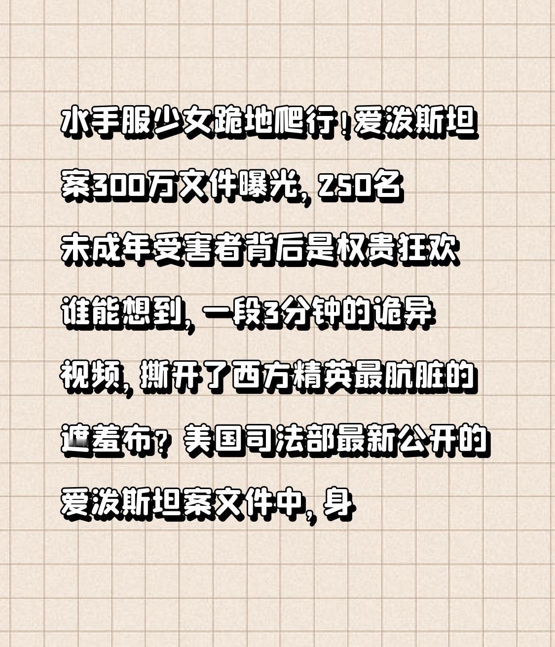 水手服少女跪地爬行!爱泼斯坦案300万文件曝光,250名未成年受害者背后是权贵狂欢 谁能想到,一段3分钟的诡异视频,撕开了西方精英最肮脏的遮羞布?美国司法部最新公开的爱泼斯坦案文件中,身穿水手服的未成年少女跪地爬行、摇铃讨好的画面,让全球网友震怒——这哪里是视频,分明是特权阶层对生命的公然践踏! 视频拍摄于2000年代初的棕榈滩豪宅,画面细节令人窒息:12-14岁的女孩身着水手服,跪在地板上与餐桌旁的成人对话,为了讨好对方,她笑着摇动手中的铃铛,最后竟跪地爬行至门口才起身关门。背景白板上写着“意大利辣香肠”“Fuskko?”等不明词汇,被网友解读为性剥削的暗语符号。美国司法部已明确定性,女孩是爱泼斯坦性剥削网络的受害者,而这样的未成年受害者,总数超250人,最小的仅14岁。 这起罪恶的背后,是精心设计的“狩猎陷阱”。爱泼斯坦与女友麦克斯韦以“招聘按摩师”“提供教育机会”为幌子,在全球物色未成年女孩,尤其瞄准土耳其、捷克等非英语国家的底层少女,她们或家境贫寒,或缺乏庇护,轻易就被高薪诱惑,最终沦为权贵们的“玩物”。加勒比海的“萝莉岛”更是罪恶的集中地,这里布满监控,女孩们一旦登岛就插翅难飞,曾有受害者试图游泳逃离,却被迅速抓回后遭受更残酷的虐待。 随着300万页文件的逐步公开,转折点接踵而至——一张横跨政商王室的权贵名单浮出水面。飞行日志显示,特朗普90年代至少8次搭乘爱泼斯坦私人飞机,文件中被提及超1000次;安德鲁王子在爱泼斯坦定罪后,仍邮件索要“26岁俄罗斯女性”,照片显示其跪趴在女性身上;马斯克曾主动询问“岛上最狂野派对时间”,盖茨被曝与俄罗斯少女发生关系后染病,这些都与其公开声明截然相反。更讽刺的是,这些权贵大多全身而退,安德鲁王子支付1600万英镑和解后免于刑责,克林顿26次飞行记录未触发任何调查。 更令人愤怒的是司法系统的包庇。300万页公开文件仅占总数一半,超550页关键内容被涂黑,美其名曰“保护隐私”,实则掩护共犯。核心证人弗吉尼娅·朱弗雷在多次指证后离奇自杀,墨西哥模特加布里艾拉控诉“他们在吃人”后失踪,证据链被人为断裂。75%的美国民众质疑司法受权贵操控,这场看似正义的公开,更像一场自导自演的“遮羞秀”。 视频中的水手服女孩,只是无数受害者的缩影。她们的人生被强行改写,有的患上严重PTSD靠药物度日,有的在绝望中自杀,而施暴者却依旧过着光鲜亮丽的生活。这起案件早已超越个体犯罪,暴露的是西方社会“金钱通吃、权力至上”的畸形本质——当特权可以凌驾于法律之上,当未成年的尊严可以被肆意践踏,所谓的“文明”不过是自欺欺人的谎言。 爱泼斯坦虽已在狱中离奇死亡,但正义不该随之埋葬。每一个被曝光的细节,每一次舆论的声讨,都是在为受害者发声。我们期待彻底的调查,期待所有涉案者都能付出代价,更期待这个世界能真正守护未成年人的安全。 支持追查到底、还受害者公道的,点个赞让更多人看到:特权再大,也不能成为罪恶的保护伞;沉默太久,更要为正义呐喊!你认为这些涉案权贵该被追责吗?欢迎在评论区留下你的看法。