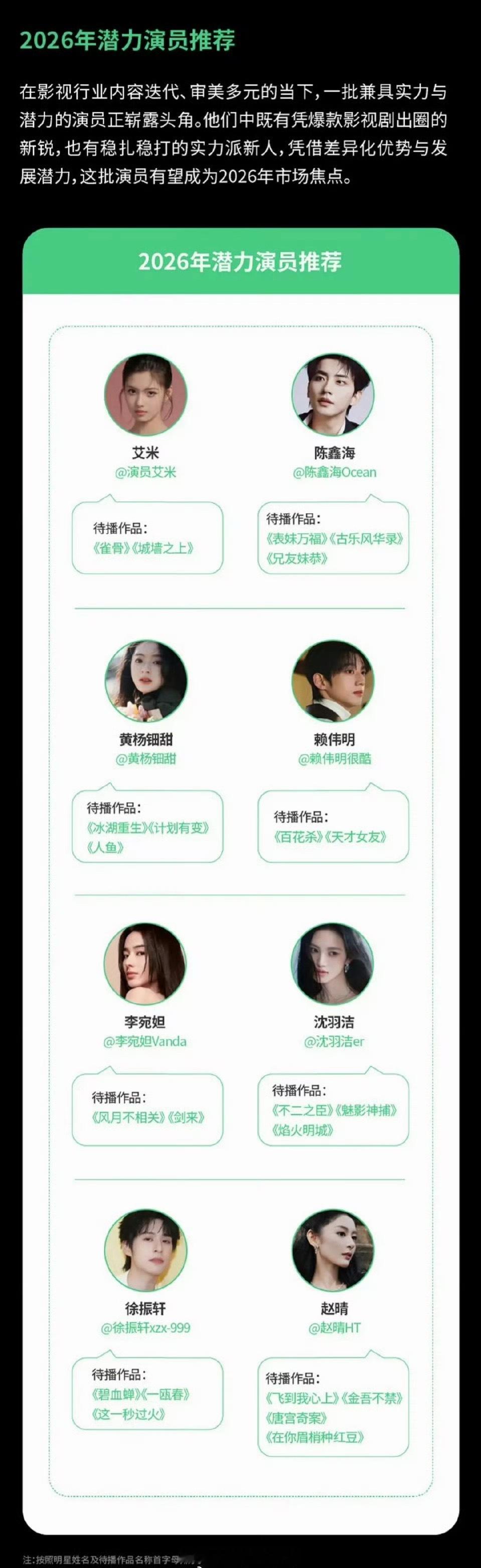 2026年潜力演员推荐:艾米、陈鑫海、黄杨钿甜、赖伟明、李宛妲、沈羽洁、徐振轩、赵晴,同意吗?