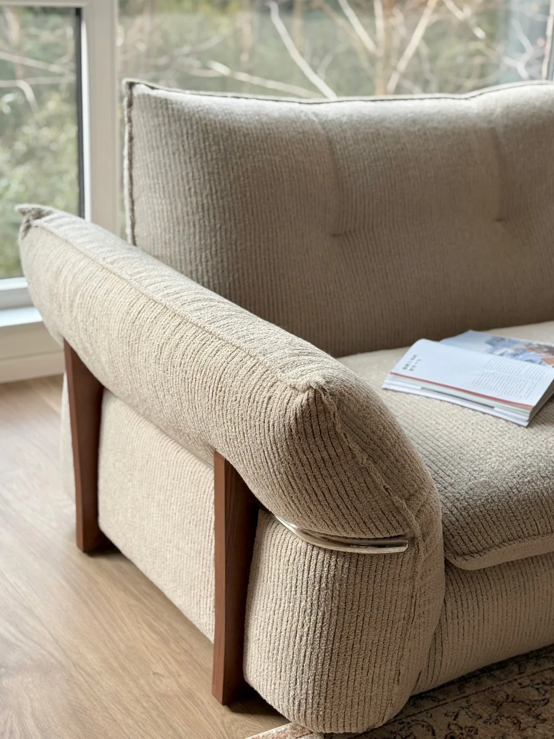 让人惊喜的是细节设计,月牙弧度的扶手不用靠枕也能贴合承托,花瓣微倾的靠背温柔包裹肩颈,横厅摆放也格外舒展。金属与白蜡木拼接的扶手太点睛,时髦感与自然温润碰撞,让慵懒中不失精致。