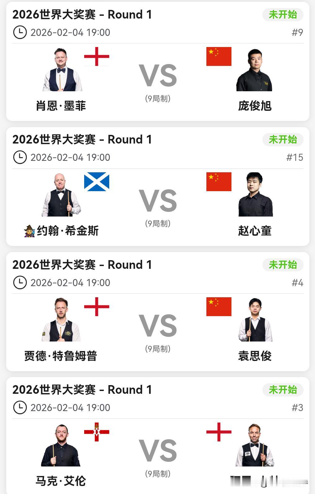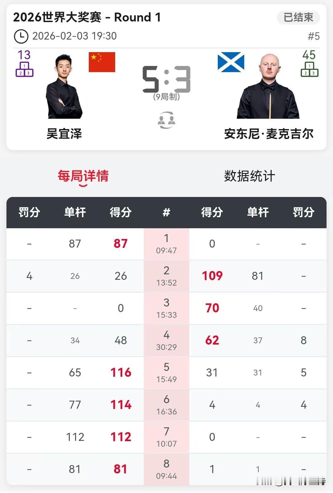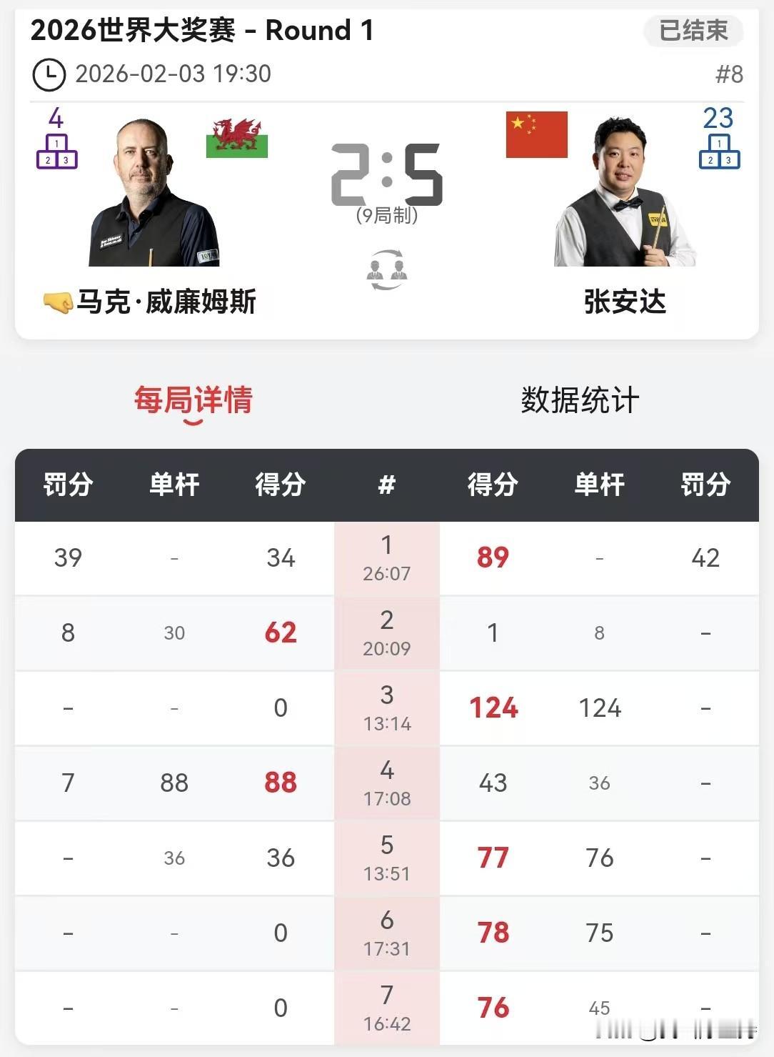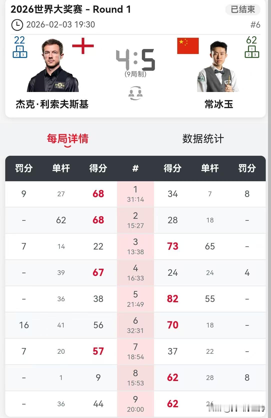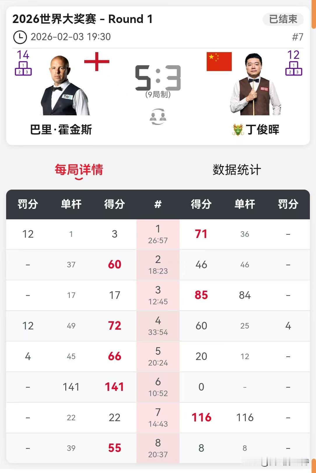 丁俊晖再次止步首轮。 香港世界大奖赛,首日比赛结束。除了丁俊晖马失前蹄,其他中国选手悉数过关。 下午,肖国栋和张安达过关。 晚上,张安达5-2战胜威廉姆斯,率先晋级。张安达发挥一如既往稳定,围球也是丝丝入扣。威廉姆斯单靠准度,白球走位不尽如人意。 吴宜泽在1-3落后的局面下,爆发惊人战斗力,连鞭4局,5-3击败麦克吉尔。逆境下的吴宜泽打出了自己的水准。 丁俊晖久疏战阵,明显不适应,3-5不敌霍金斯。 常冰玉和利索夫斯基打了一场失误连连的比赛,就看谁运气好一点,最终常冰玉笑到最后。 下一轮,常冰玉对阵吴宜泽,张安达对阵霍金斯。 明天,赵心童、庞俊旭、袁思俊、斯佳辉4名中国球员出场,将会几位晋级呢?
