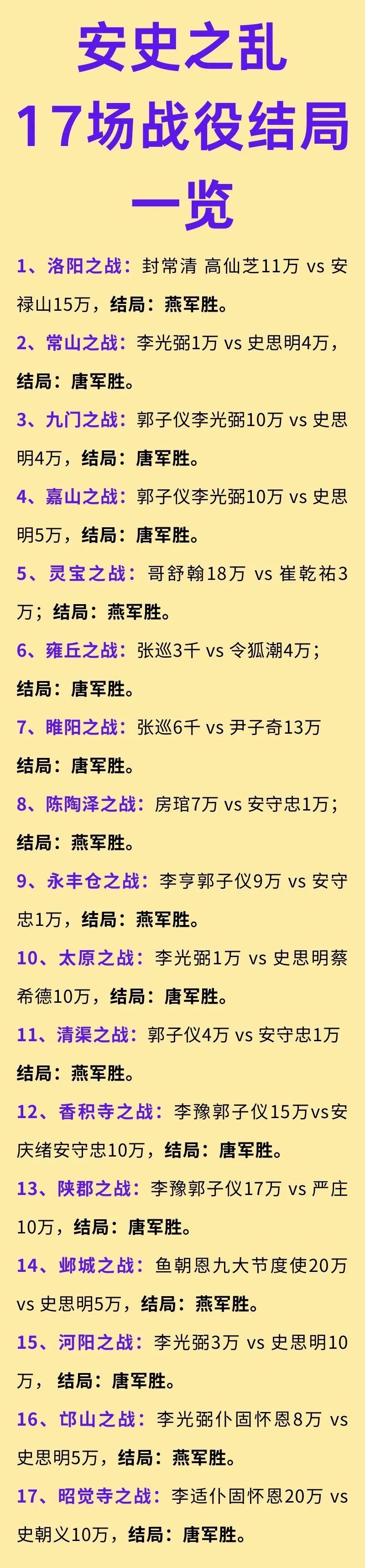 安史之乱中的17场重要战役。 在8年的安史之乱中,一共大小战役有数百次,这17场属于是关键战役。 其中唐军胜了10场,燕军胜了7场。 看起来好像唐军胜场多。 对于整个唐朝来说,虽然名义上唐朝是获胜的,着实是一场惨胜,而不是完胜。 因为从这个时候起,连唐诗都变了,从盛唐时期的豪迈奔放,直接转向了沉郁写实。