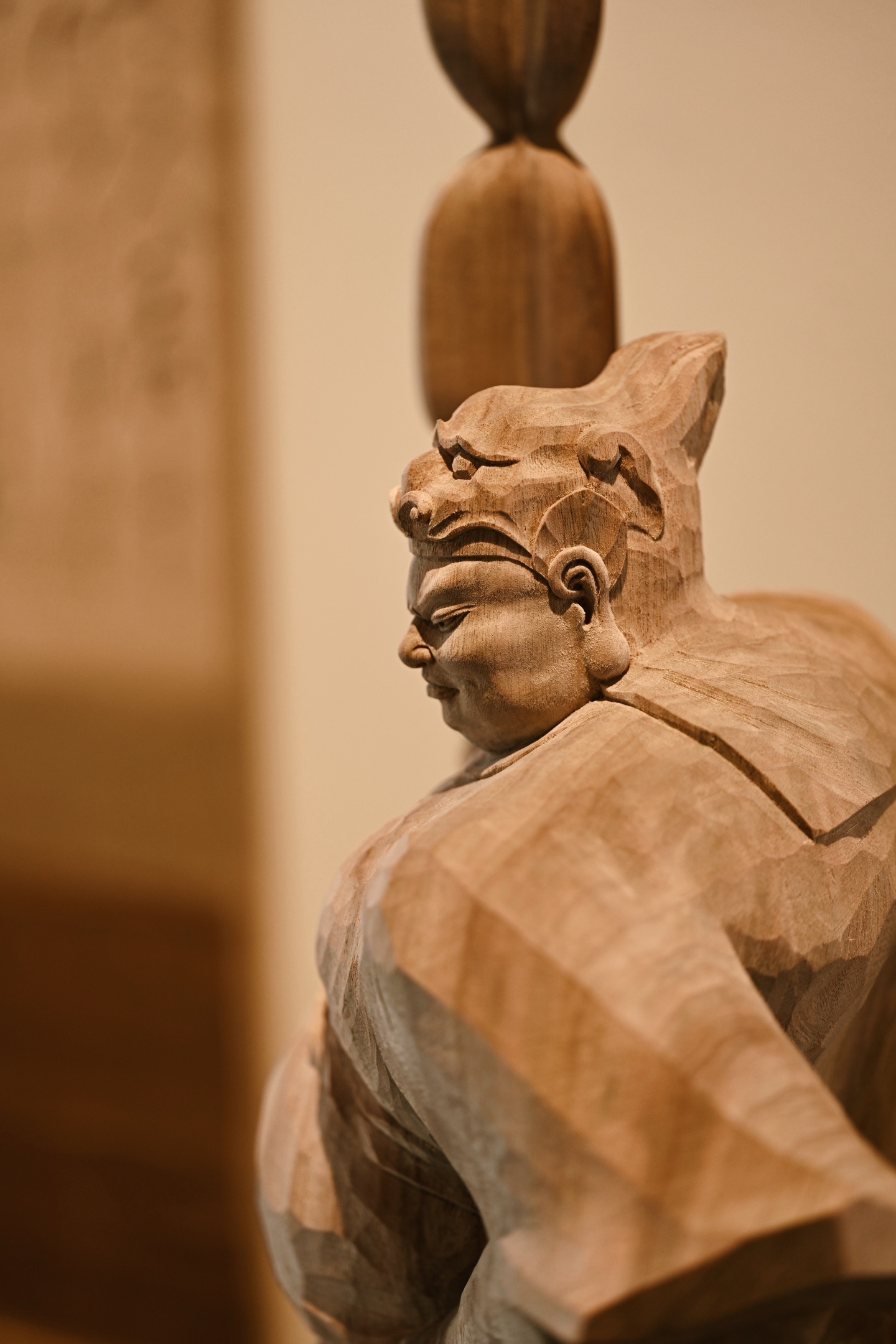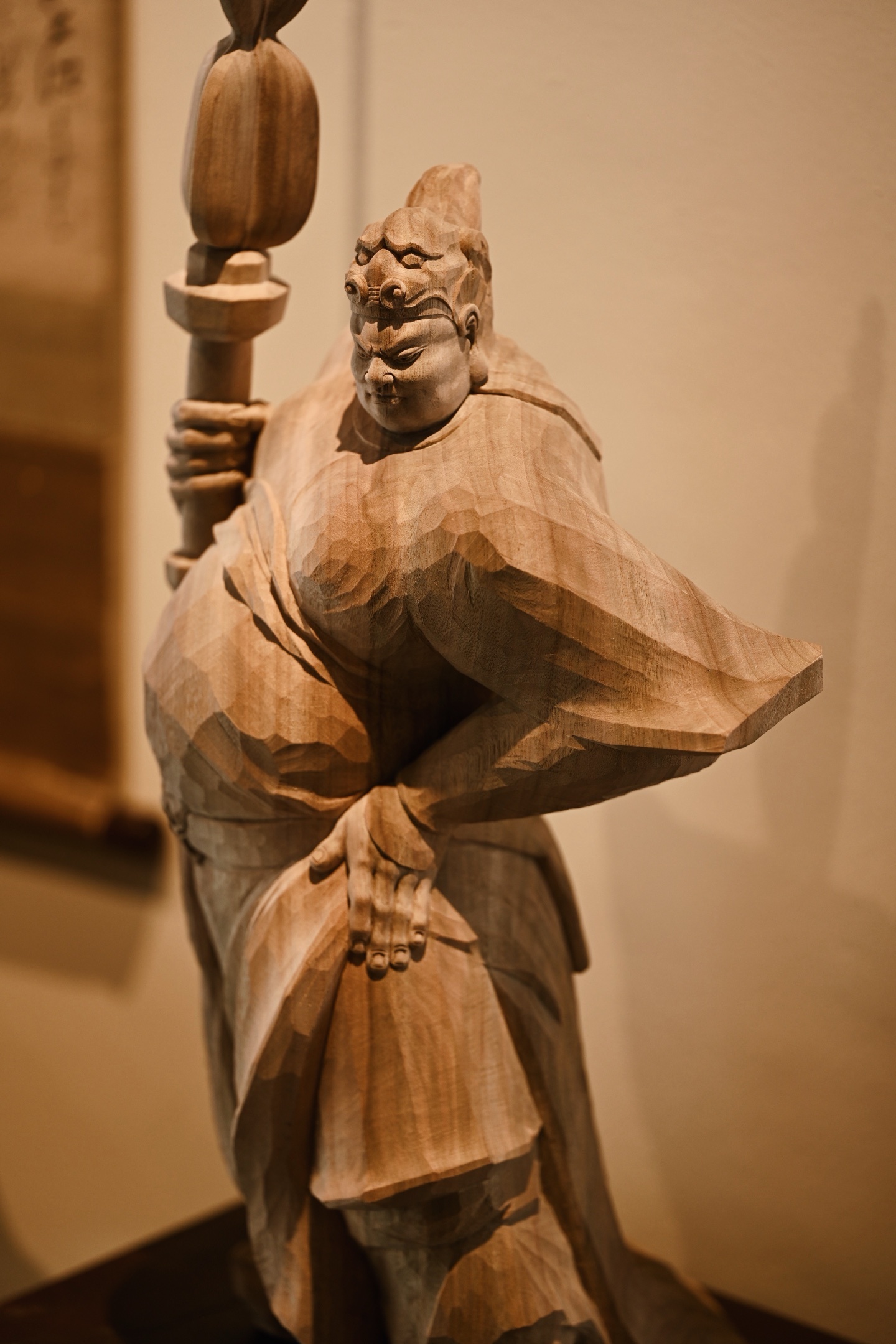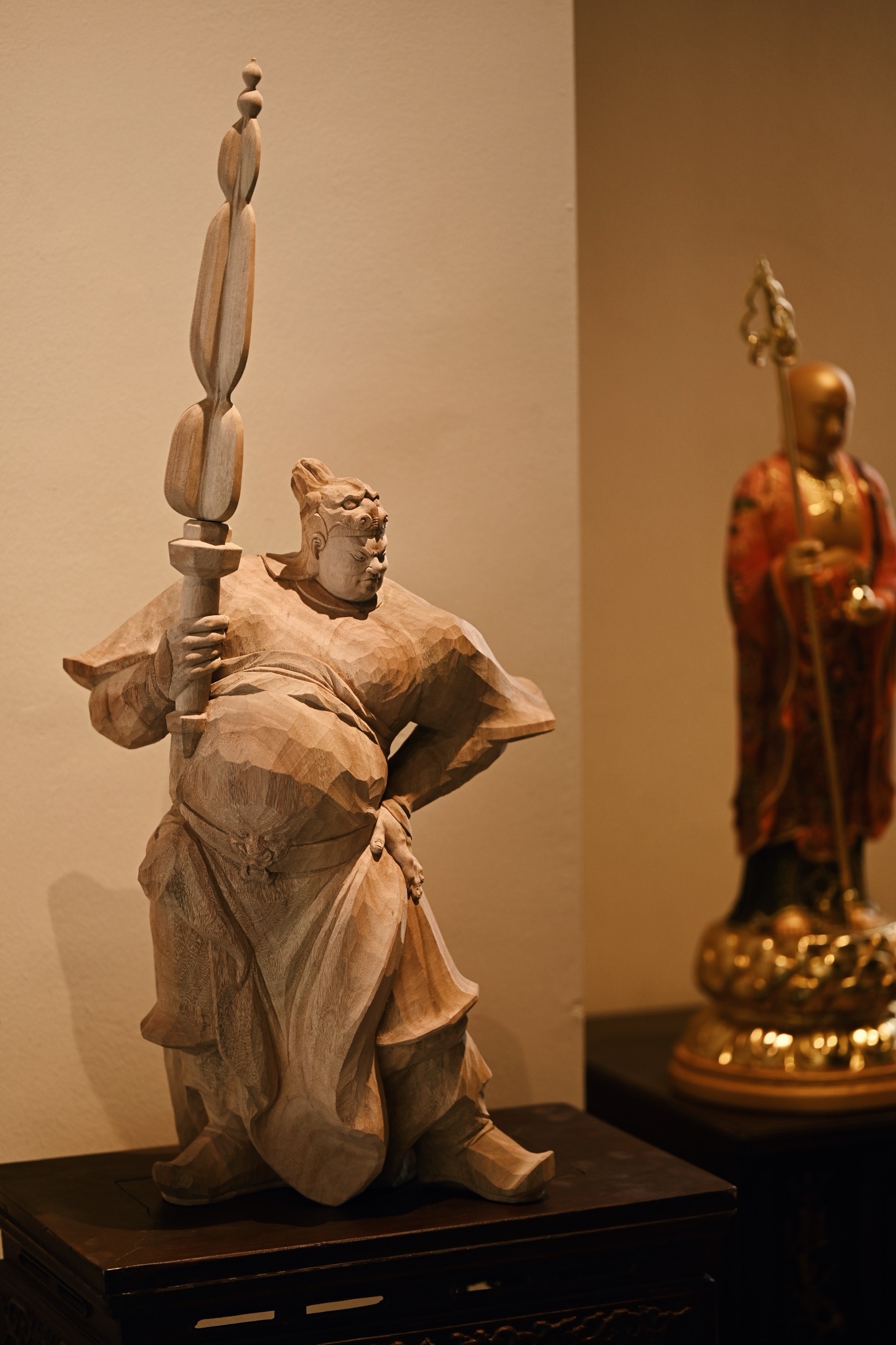 快刀雕刻,细腻生动,韦陀头戴凤翅兜鍪盔,相容坚毅,袍袖翻飞,姿态英武,韦陀一手高举金刚杵,含威不露,奇伟神武。