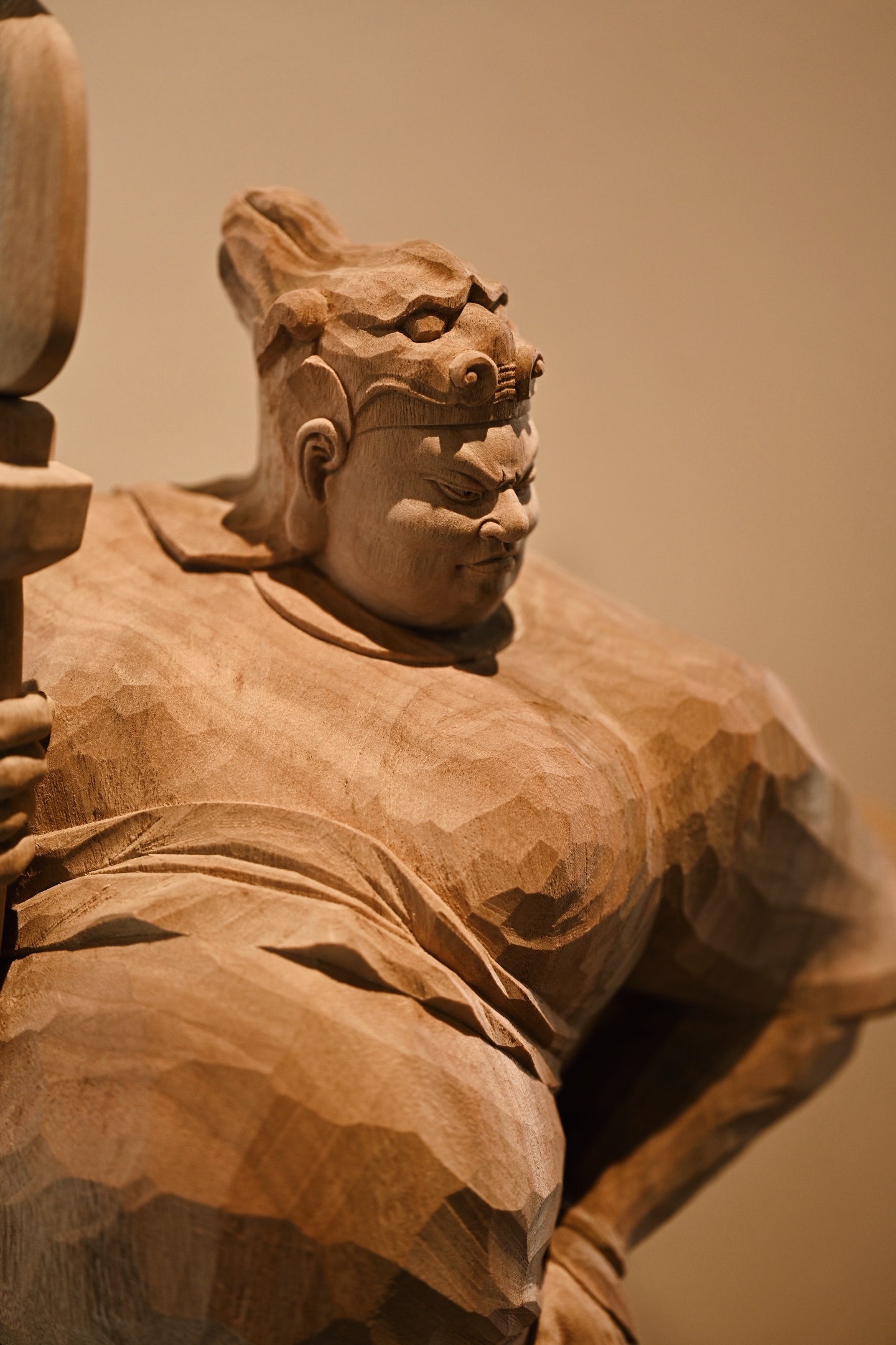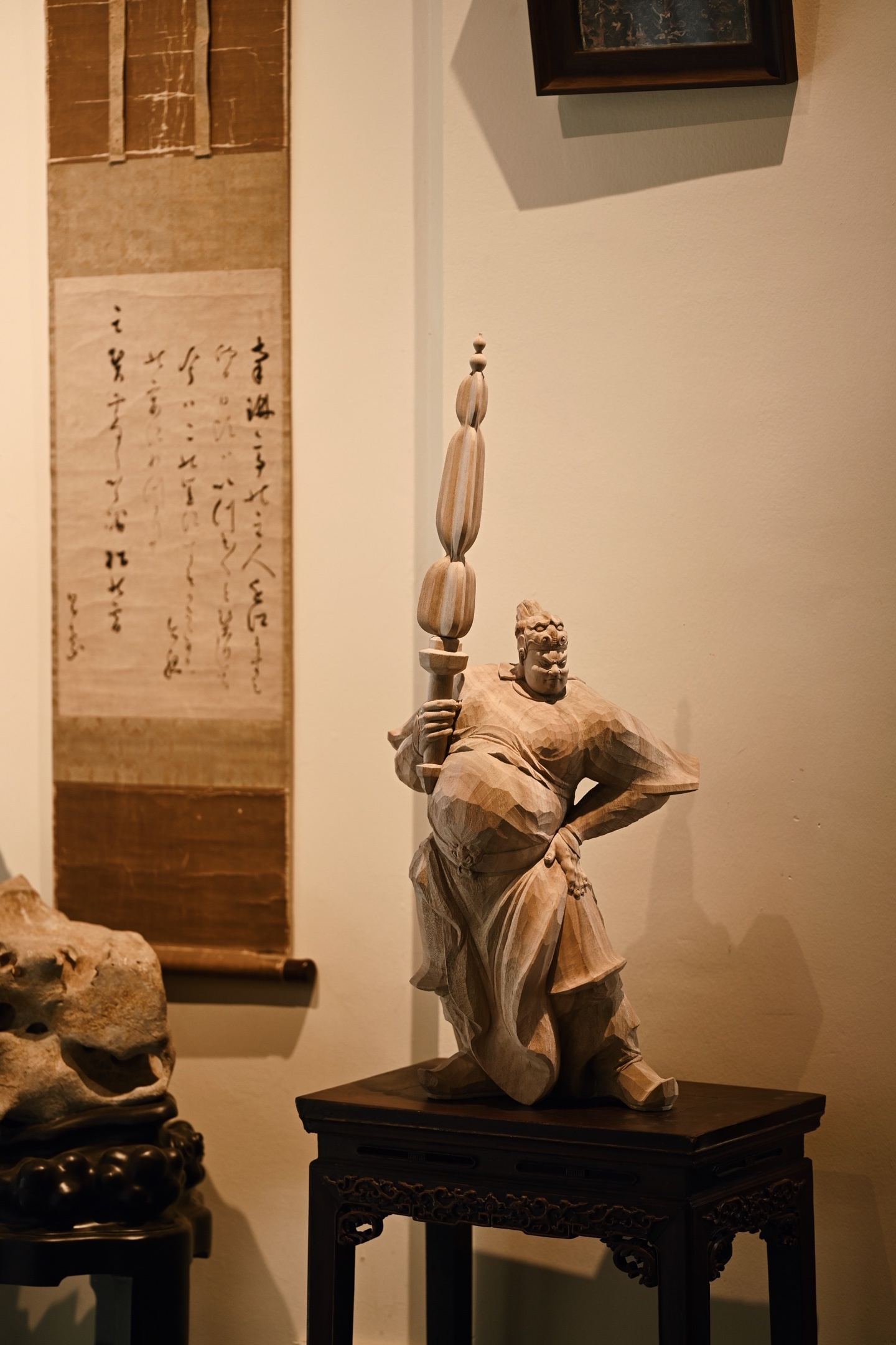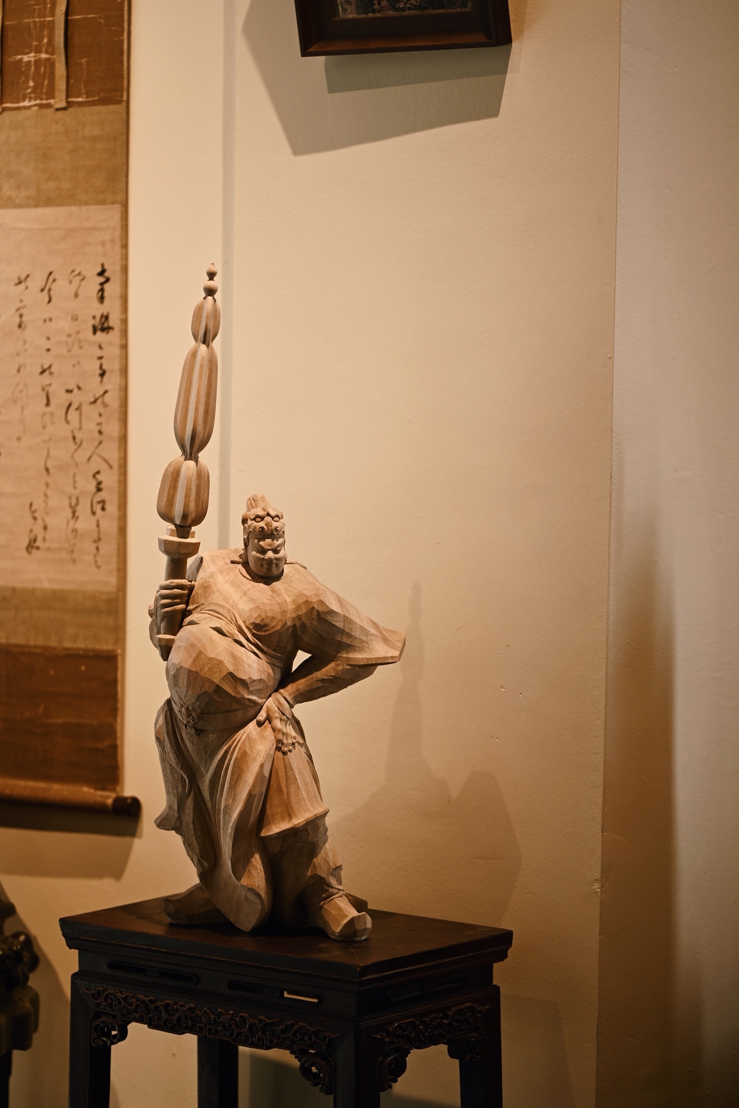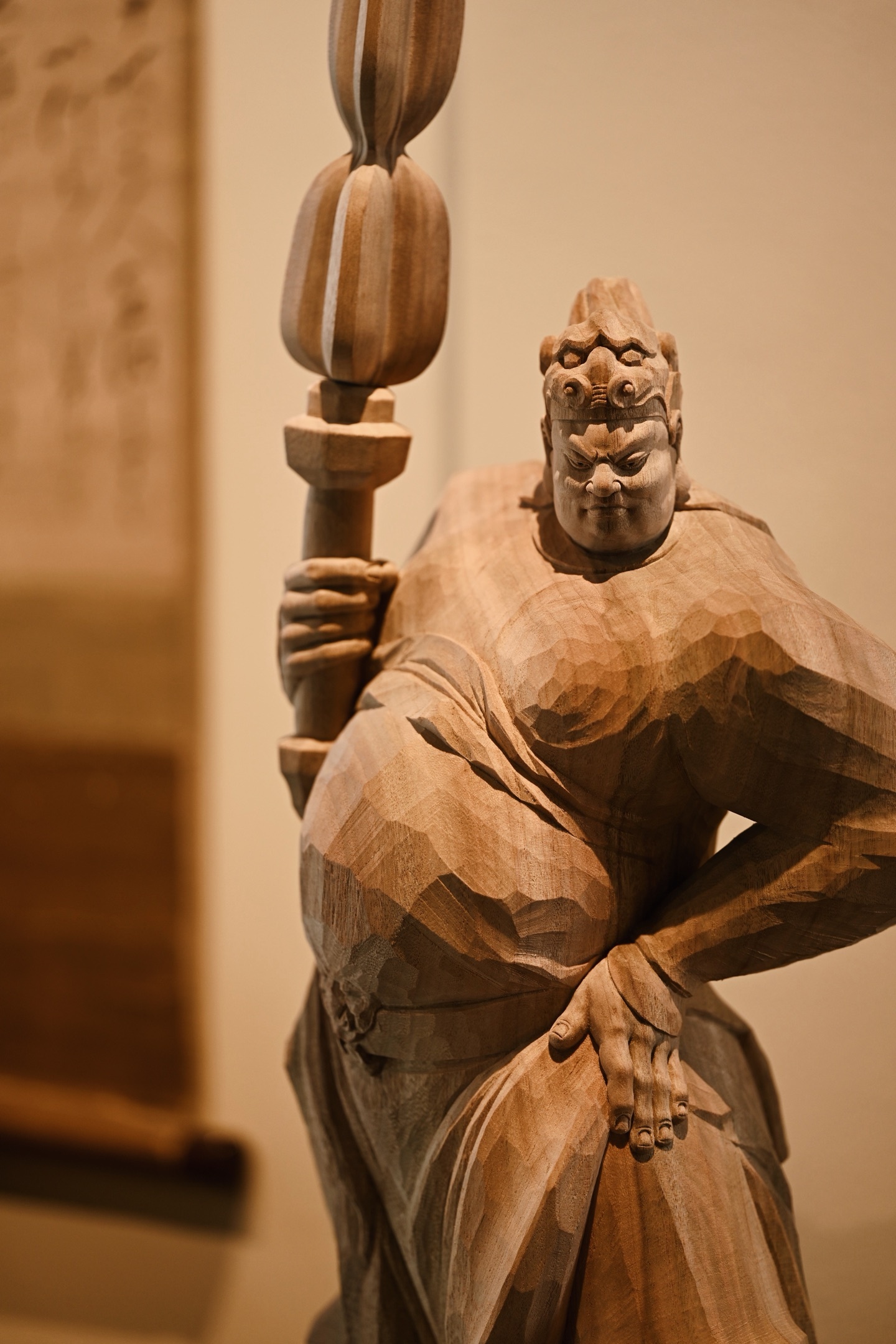 快刀雕刻,细腻生动,韦陀头戴凤翅兜鍪盔,相容坚毅,袍袖翻飞,姿态英武,韦陀一手高举金刚杵,含威不露,奇伟神武。