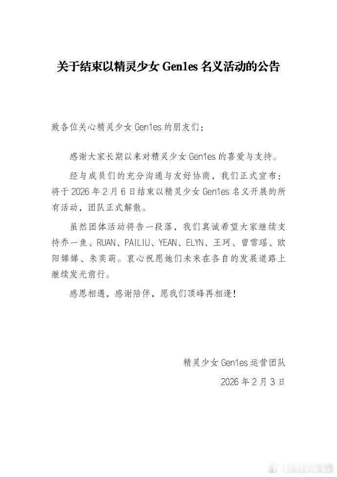 精灵少女官宣解散精灵少女结束组合活动2月3日,发布公告,官宣将从2月6日结束以