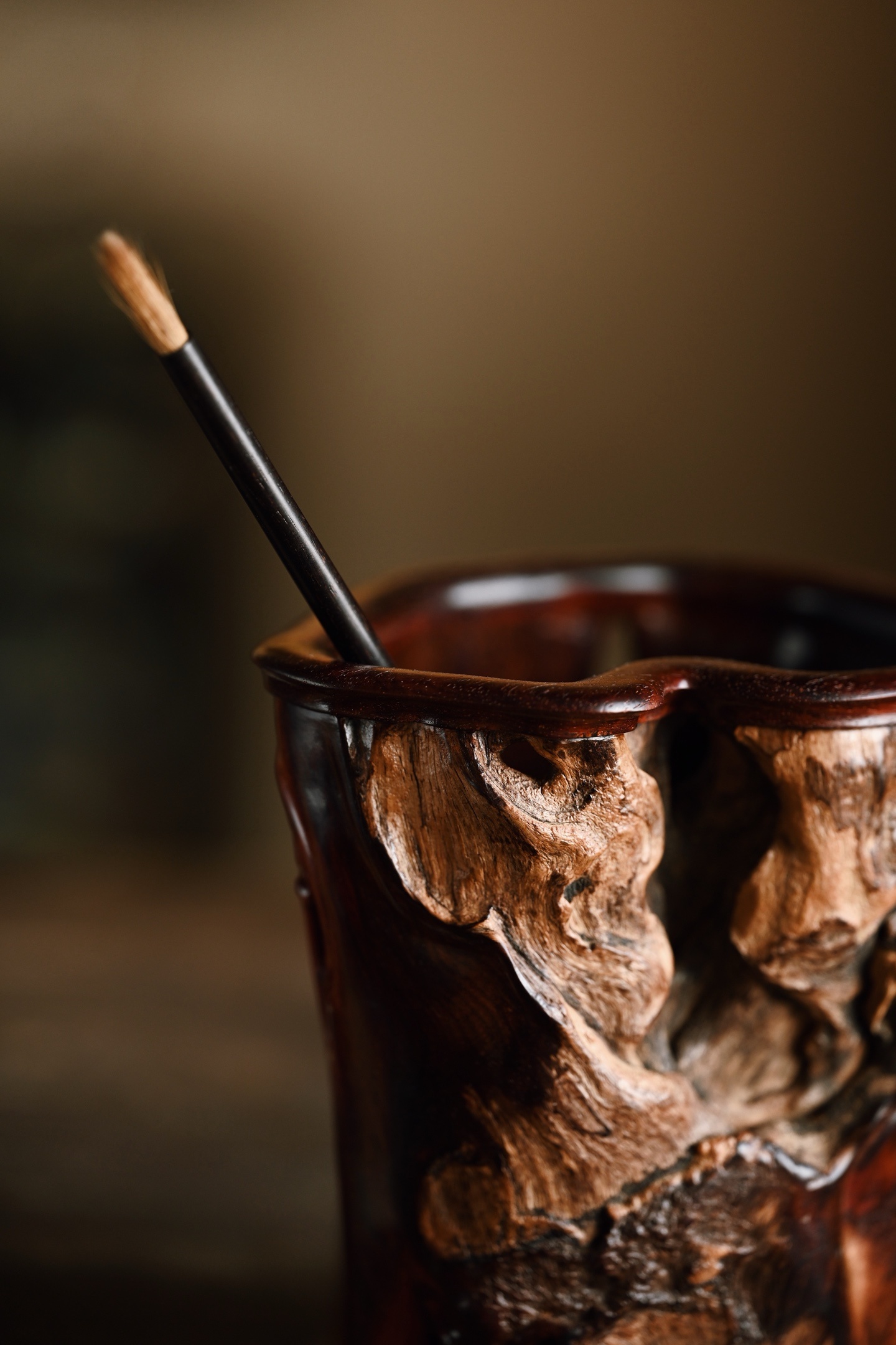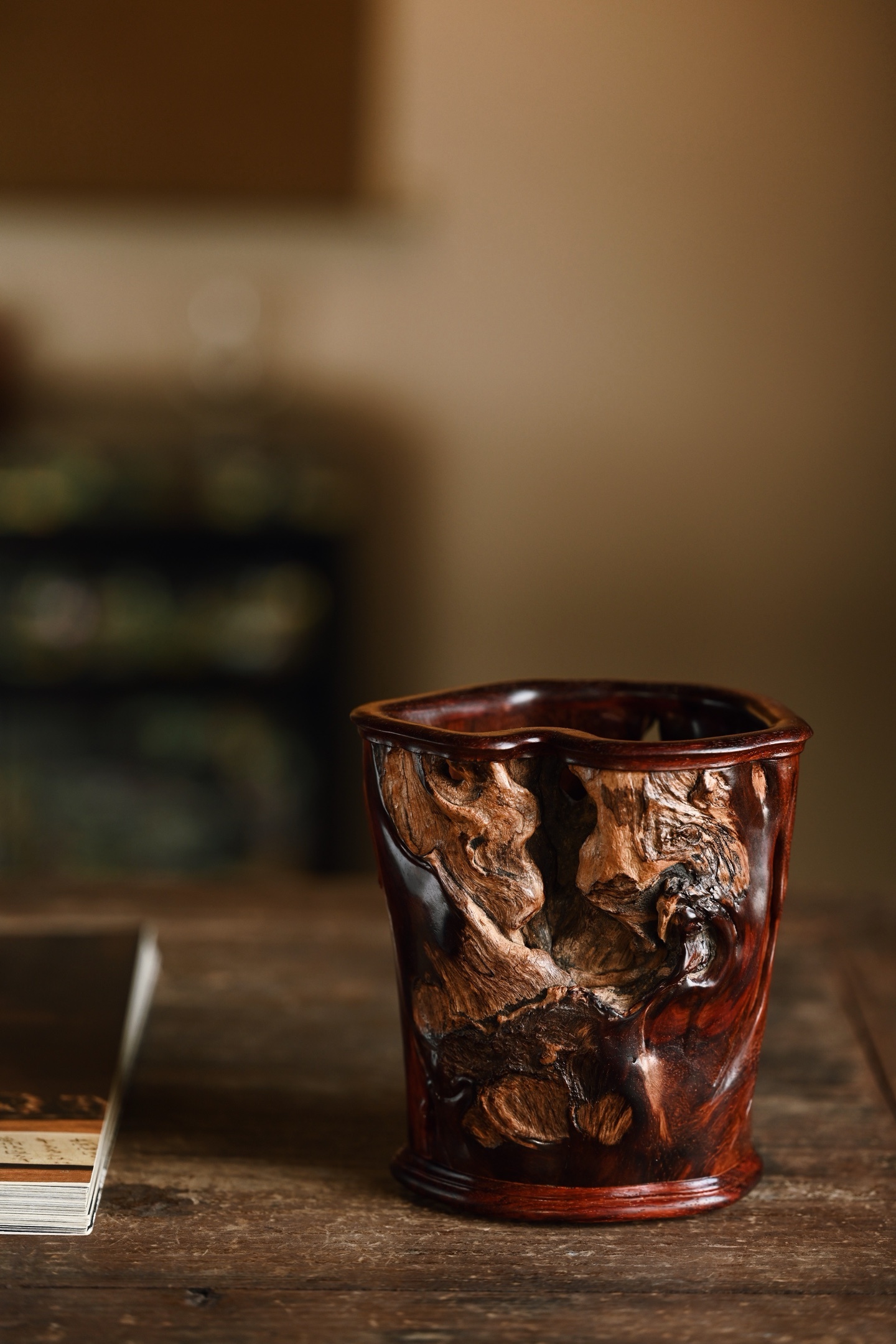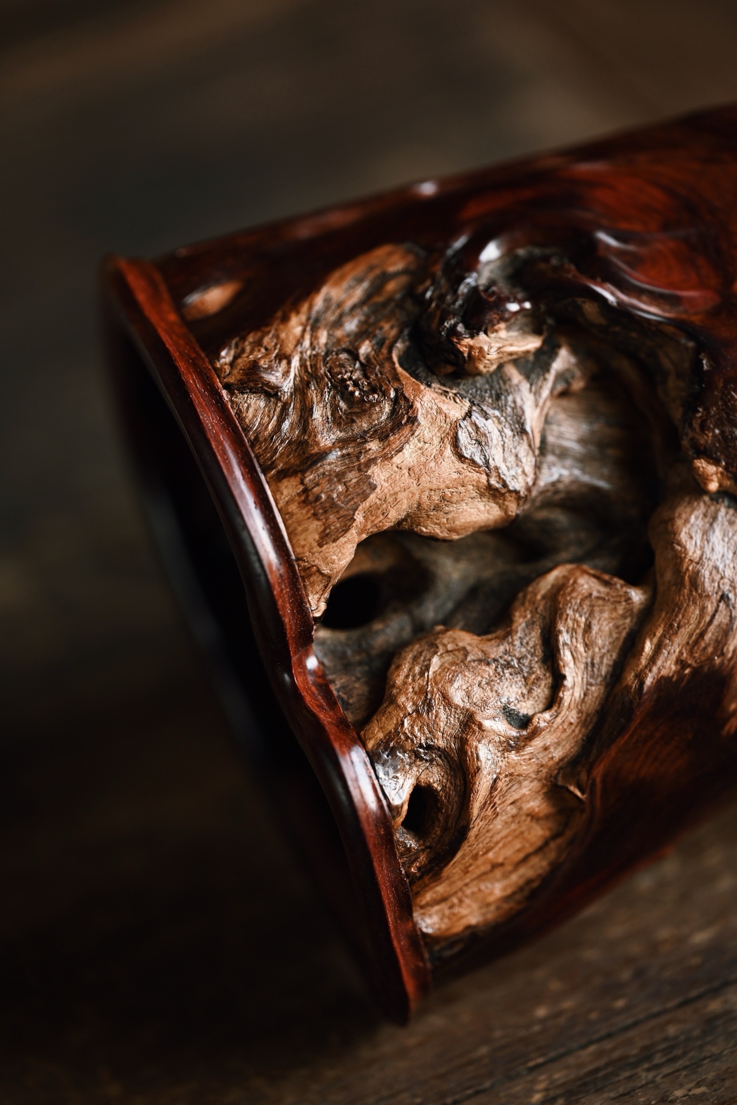 采用天然风化料雕刻,保留局部原皮,皮壳细腻,纹理卷曲自然,筒身有天然孔洞,极富自然质感。