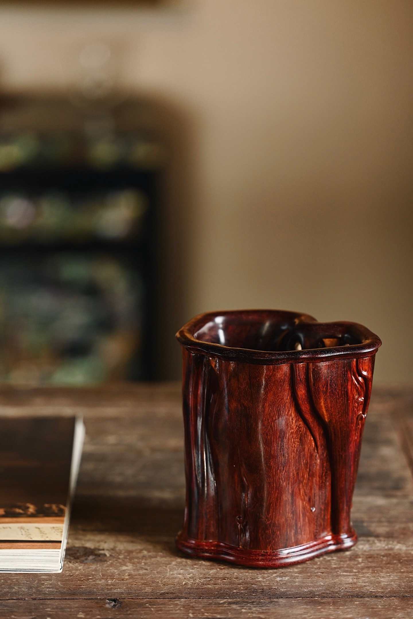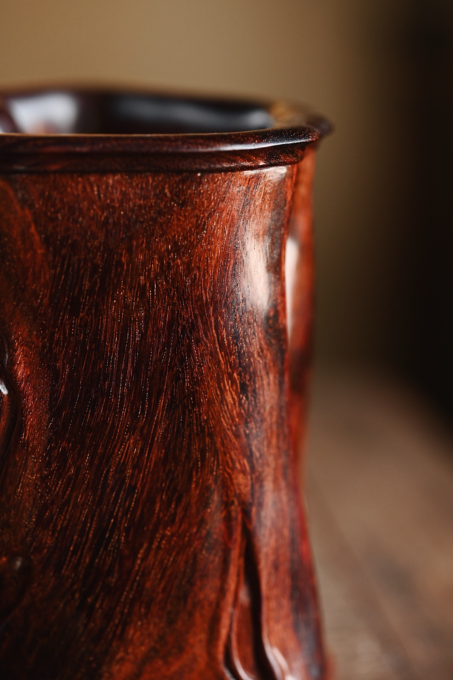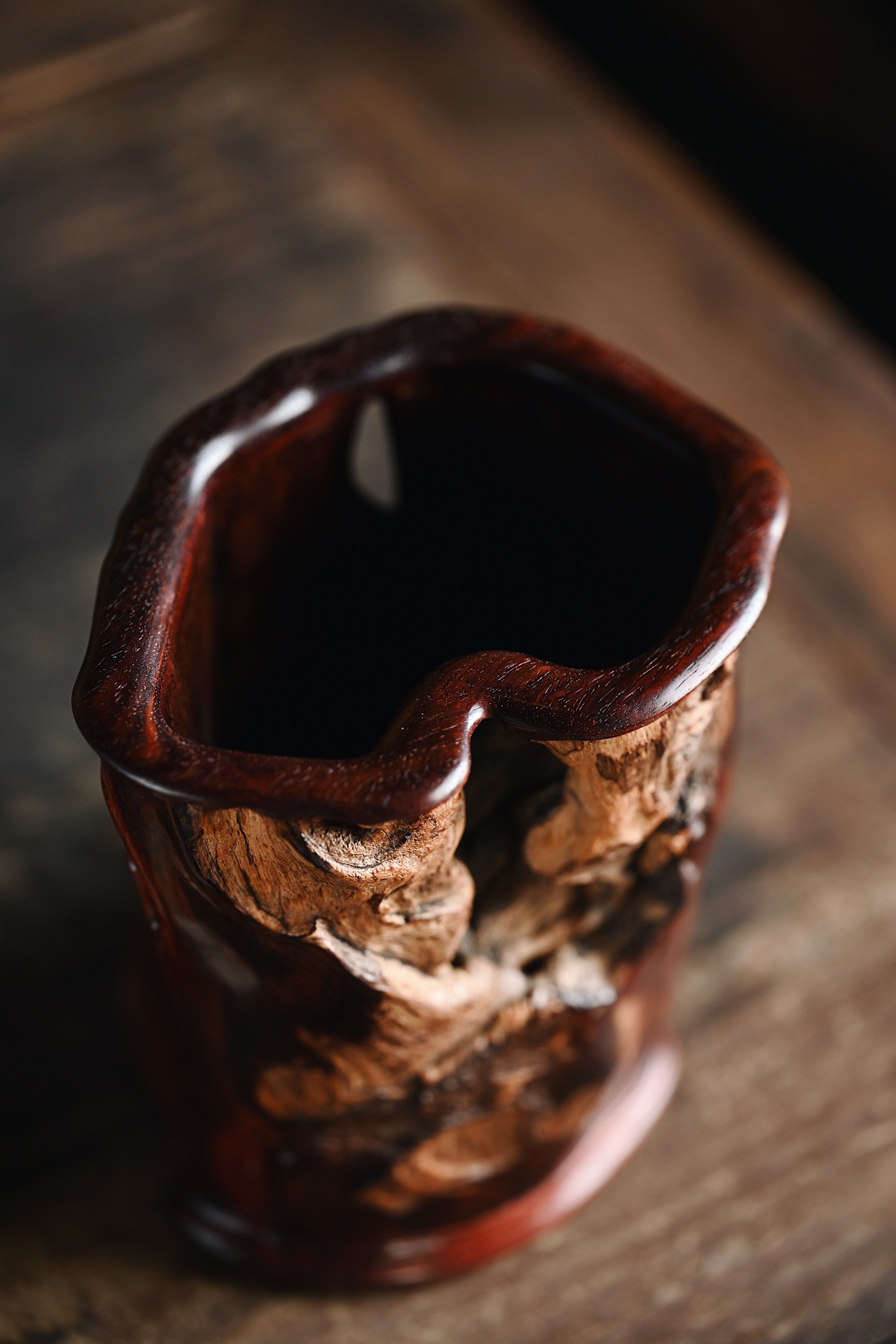采用天然风化料雕刻,保留局部原皮,皮壳细腻,纹理卷曲自然,筒身有天然孔洞,极富自然质感。