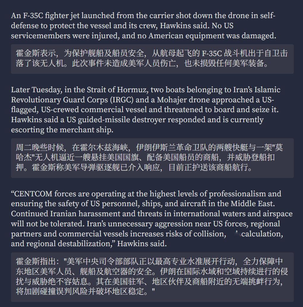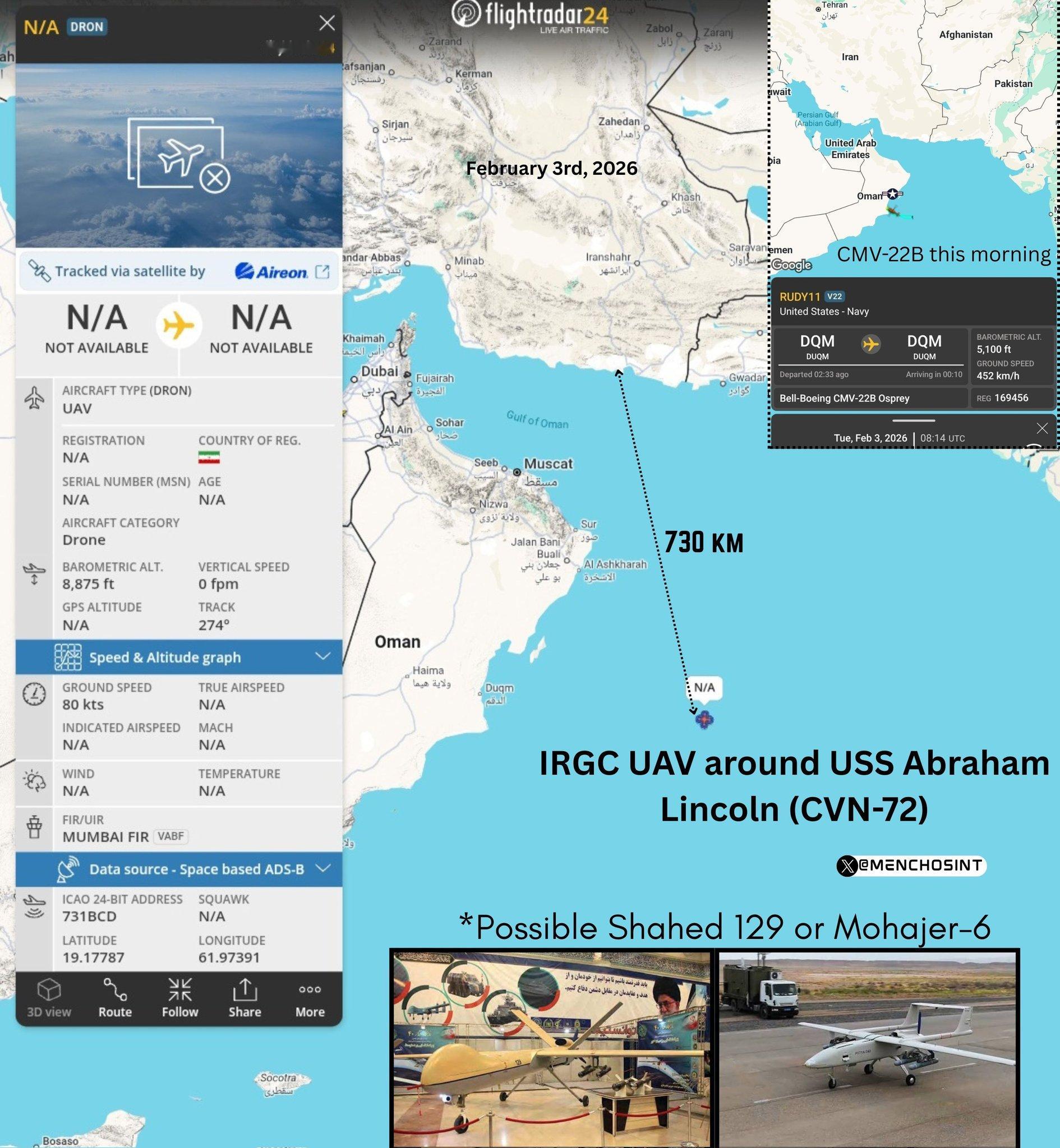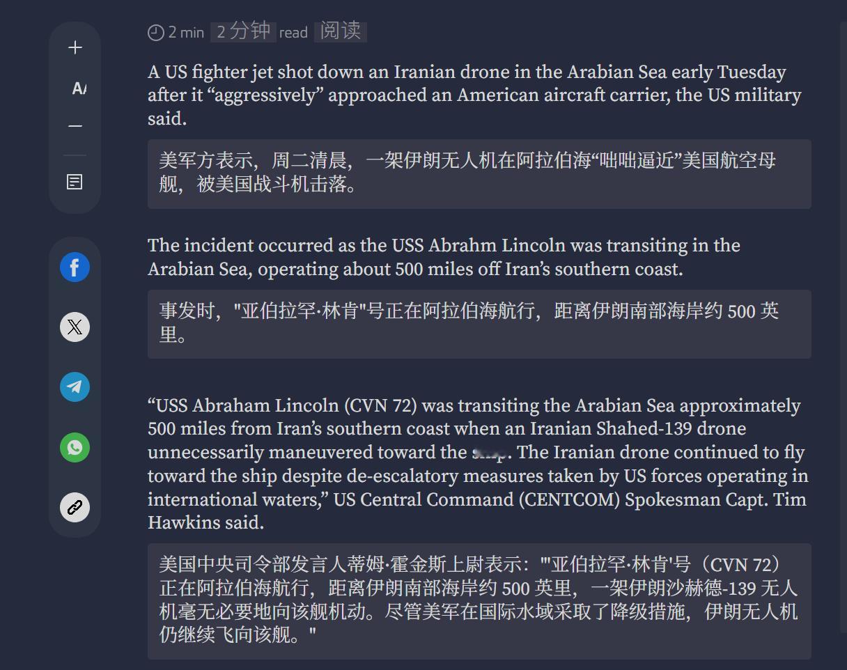 🔻突发新闻:美军中央司令部在其官方账户上发布消息称,美国海军亚伯拉罕·林肯号航母的 F-35C 战机击落了今天早些时候发现的一架无人机:Shahed-139 型。🔻该事件发生时,林肯号航母正在阿拉伯海航行,于伊朗南部海岸约 500 英里外作业。🔻早些时候,航空跟踪网站F24上显示一架伊朗无人机在阿拉伯海上空活动,位于美国林肯号航空母舰附近。该目标信号仅出现了 1 分钟,(识别码 731BCD)。🔻那么……接下来会发生什么?伊朗一无人机飞近美航母被击落 爱泼斯坦档案泄露或加快伊朗遇袭 热点现场 海外新鲜事