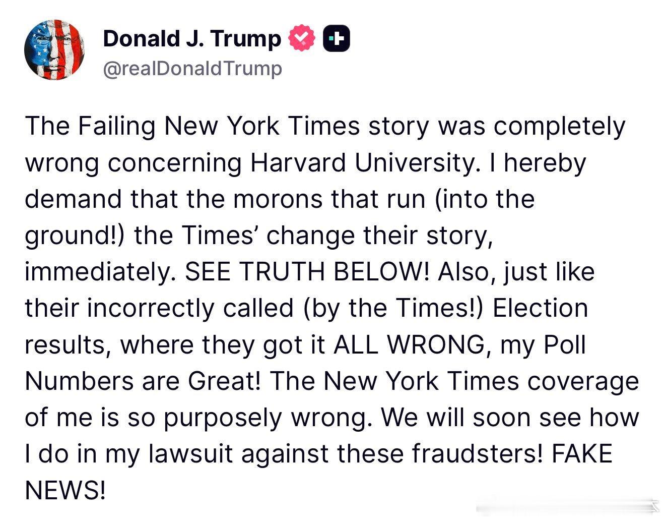 “我在此要求那些把《纽约时报》搞得一团糟的蠢货们立即修改报道。真相如下!还有,就像他们(《纽约时报》!)错误预测的选举结果一样,我的民调支持率也非常好!