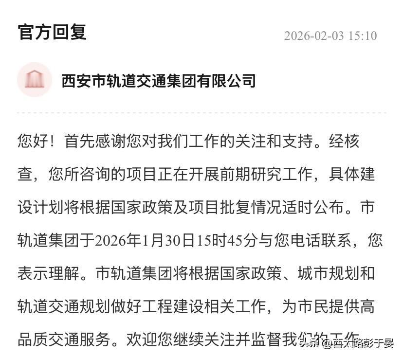 地铁17号线最新进展 你好,麻烦问一下地铁17号线还建设吗?建设的话最新进展如何?近期,发布的明确以后城际铁路建设要求对17号线有影响吗? 官方回复 2026-02-03 15:10 西安市轨道交通集团有限公司 您好!首先感谢您对我们工作的关注和支持。经核查,您所咨询的项目正在开展前期研究工作,具体建设计划将根据国家政策及项目批复情况适时公布。市轨道集团于2026年1月30日15时45分与您电话联系,您表示理解。市轨道集团将根据国家政策、城市规划和轨道交通规划做好工程建设相关工作,为市民提供高品质交通服务。欢迎您继续关注并监督我们的工作。 西安地铁 西安地铁规划