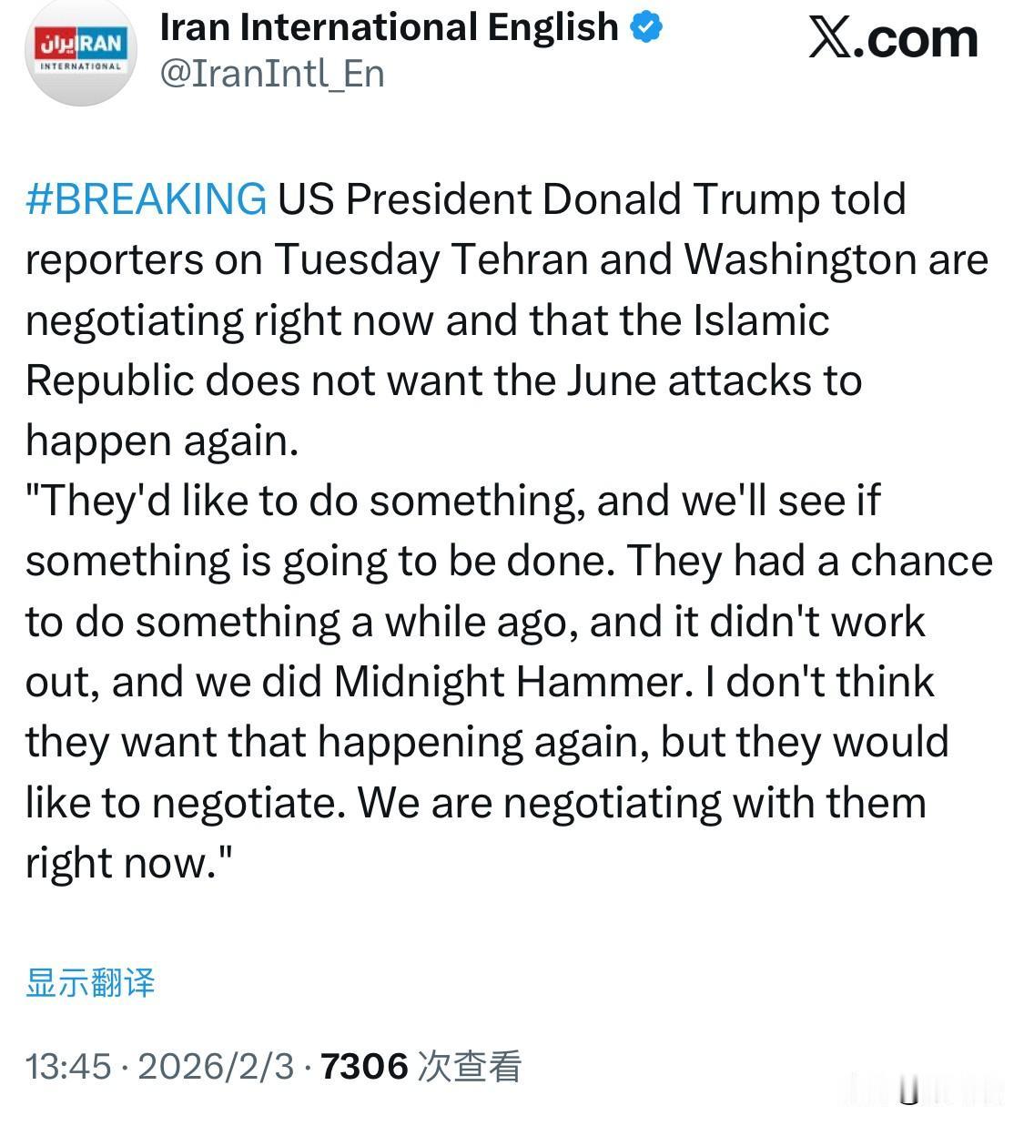 美国总统唐纳德·特朗普周二告诉记者,德黑兰和华盛顿目前正在进行谈判,伊朗伊斯兰共和国不希望6月的袭击再次发生。 “他们想做点什么,我们看看能不能成。他们之前有机会做点什么,但没成功,然后我们就搞了《午夜铁锤》。我觉得他们不想重蹈覆辙,但他们愿意谈判。我们现在正在和他们谈判。”