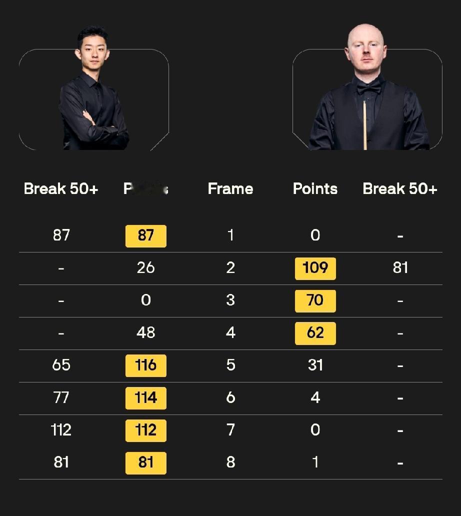 囧哥、马克·威廉姆斯、丁俊晖一轮游! 2月4日凌晨,斯诺克世界大奖赛首日八场比赛结束。 战绩如下: 肖国栋 5-2 凯伦·威尔逊 马克·塞尔比 5-0 亚伦·希尔 埃利奥特·斯莱塞 5-2 斯图尔特·宾汉姆 周跃龙 5-2 斯蒂芬·马奎尔 巴里·霍金斯 5-3 丁俊晖 马克·威廉姆斯 2-5 张安达 吴宜泽 5-3 安东尼·麦克吉尔 常冰玉 5-4 杰克·利索夫斯基 中国军团发挥出色,六战五胜!今天,赵心童、斯佳辉、袁思俊、庞俊旭出场,加油!