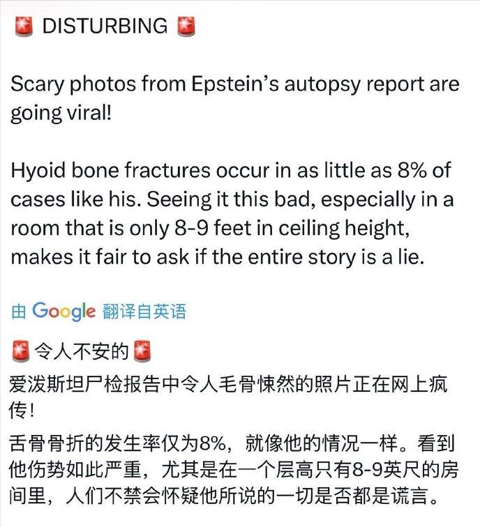爱泼斯坦真的死了吗? 所谓的 “遗体”没做 DNA 比对,也没查指纹, 狱警当班睡大觉、伪造巡查记录, 关键监控 “恰好” 出了故障,11 个摄像头里 10 个坏了, 连他7月那次自杀未遂的录像最后也被永久删除, 这么多“巧合”被司法部长称为“一连串失误的完美风暴”, 实在让人没法完全信服。 更让人起疑的是 “调包” 的说法, 有个叫罗伯托・格里哈尔瓦的狱警,在爱泼斯坦死亡消息公布前就匿名发帖, 说亲眼看到爱泼斯坦被锁在医疗轮椅上带离牢房, 还有一辆没登记的车偷偷进了监狱。 后来官方文件证实了这个发帖人真是那所监狱的狱警, 可他的说法没被调查采信,之后也再也没公开说过话,有人甚至猜他是不是出了意外。 更奇怪的是,所谓的 “遗体” 既没做 DNA 比对,也没查指纹(官方未公开相关比对记录,且无权威证据证明已做过此类鉴定) 就只是让他弟弟看了一眼确认身份, 案发后牢房也没按规定封存,遗体在 FBI 到之前就被移走了,关键物证都可能被动过手脚。 有人说他知道太多权贵的黑料,是被人悄悄灭口,好封住他的嘴。 也有人顺着调包的疑点往下猜,说他根本没死,找了替身顶包,早就带着钱财隐姓埋名了。 更有各种离奇说法,说他在私人小岛搞诡异勾当,背后牵扯着见不得光的秘密。 后来就算公布了部分监控、发布了详细调查报告,这些传言也没停下来,总有人觉得官方在刻意隐瞒什么。 虽然美国官方的答案很肯定,说他2019年8月在纽约监狱里用床单上吊自杀, 法医和后续调查也都认了这个结果。 但无风不起浪,这些传言是真是假可能永远也不会有人知道了。