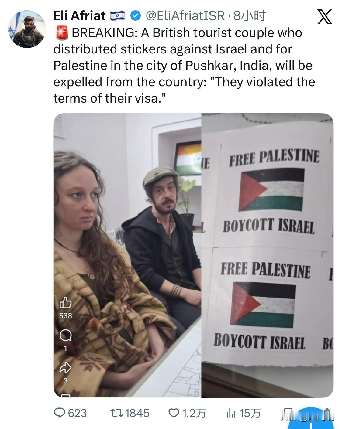根据 2026 年 2 月初的最新消息,两名在印度拉贾斯坦邦普什卡 (Pushkar) 旅游的英国游客确实已被要求限期离境。 涉事者为 36 岁的刘易斯·加布里埃尔·迪(Lewis Gabriel Dee)及其女性同伴埃纽西·艾玛·克里斯汀(Anueshi Emma Christine),两人均为英国公民。 他们在普什卡的公共场所张贴印有“Free Palestine, Boycott Israel”(自由巴勒斯坦,抵制以色列)等标语的贴纸和海报。普什卡是著名的旅游胜地,尤其受以色列游客欢迎。 拉贾斯坦邦警方刑事调查局(CID)于 2026 年 2 月 2 日(周一)向两人发出了“离境通知 (Leave India Notice)”。 违规依据:根据印度《移民与外国人法案》,持有旅游签证的外国公民被严禁从事任何形式的政治活动。当局认为他们的行为违反了签证条款,并可能触及当地的敏感性。 目前状态:据报道,两名游客已就其行为道歉,并告知有关部门正在办理回程机票,准备按要求尽快离开印度。