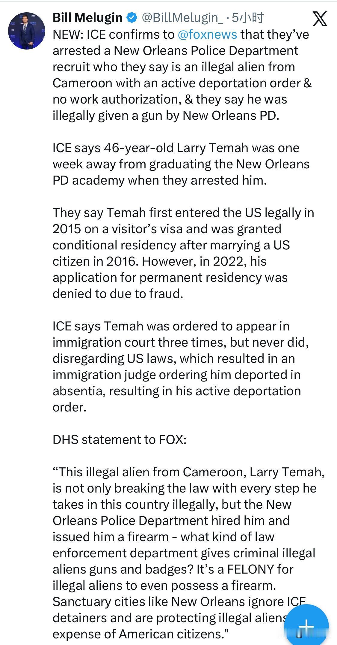 最新消息:美国移民及海关执法局 (ICE) 向福克斯新闻证实,他们逮捕了一名新奥尔良警察局新入职警员,称其为来自喀麦隆的非法移民,持有有效的驱逐令且没有工作许可,并称新奥尔良警察局非法向其提供了枪支。 美国移民及海关执法局 (ICE) 表示,46 岁的拉里·特马赫 (Larry Temah) 在被逮捕时,距离从新奥尔良警察学院毕业仅剩一周时间。 据称,特马于 2015 年首次持旅游签证合法进入美国,并在 2016 年与一名美国公民结婚后获得有条件永久居留权。然而,2022 年,他的永久居留权申请因涉嫌欺诈而被拒绝。 美国移民及海关执法局 (ICE) 表示,特马赫曾三次被传唤到移民法庭出庭,但他从未出庭,无视美国法律,导致移民法官缺席下令将其驱逐出境,从而导致他被强制执行驱逐令。 美国国土安全部向福克斯新闻发表声明: “这个来自喀麦隆的非法移民拉里·特马,不仅每一步都触犯法律,而且新奥尔良警察局竟然还雇佣了他,并给他配发了枪支——什么样的执法部门会给犯罪的非法移民发放枪支和警徽?非法移民持有枪支本身就是重罪。像新奥尔良这样的庇护城市无视美国移民及海关执法局(ICE)的拘留令,以牺牲美国公民的利益为代价来保护非法移民。”