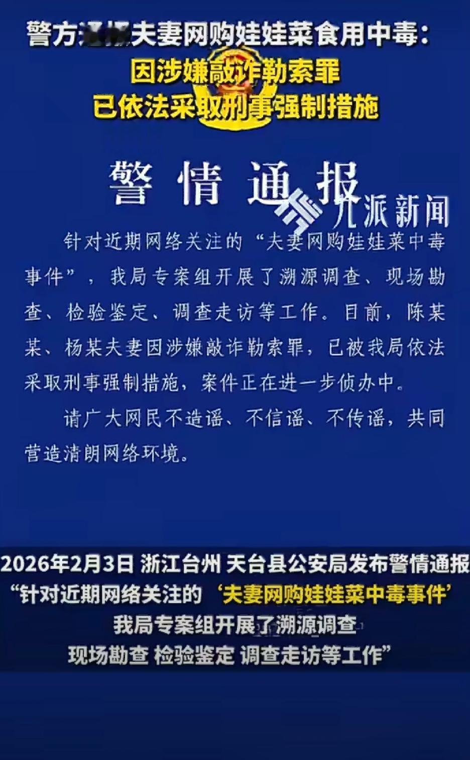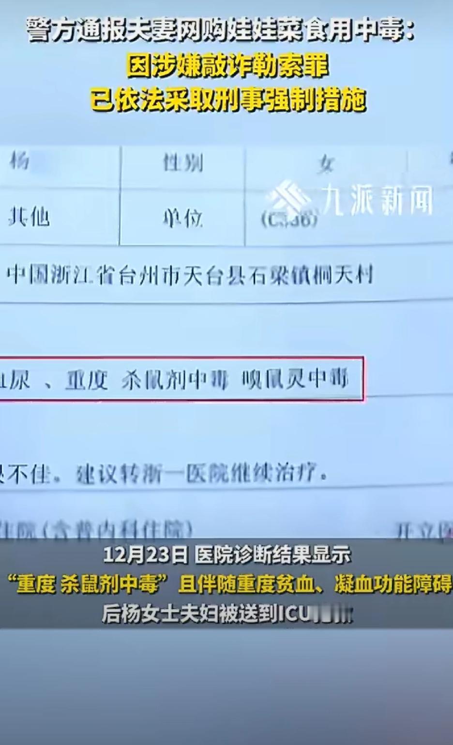 反转反转再反转,此计虽险,但是确实可刑。 浙江台州那个娃娃菜中毒事件我以为只是单纯的食物中毒,后面又变成了丈夫要毒害老婆,最后却又成了夫妻恶意自导自演准备敲诈勒索,钱是没敲诈到,但是刑是真刑,这顿牢狱之灾我看是免不了了。 我觉得是真该,自从看了他们的事,吓的我对蔬菜都有心理阴影了,还好事情最终反转了,不然我估计不止我一个人被吓成这样。 人有时候自作聪明也不行,现在都什么年代了,一些低级的伎俩就别在帽子叔叔面前显摆了,分分钟给你查个底朝天!整个事件最无辜的受害者就是网店的店家了,据说店铺因为这个事件已经关闭了。我就想不通了,有对自己这么狠的胆量,干什么事成不了,何必做这种事情呢?