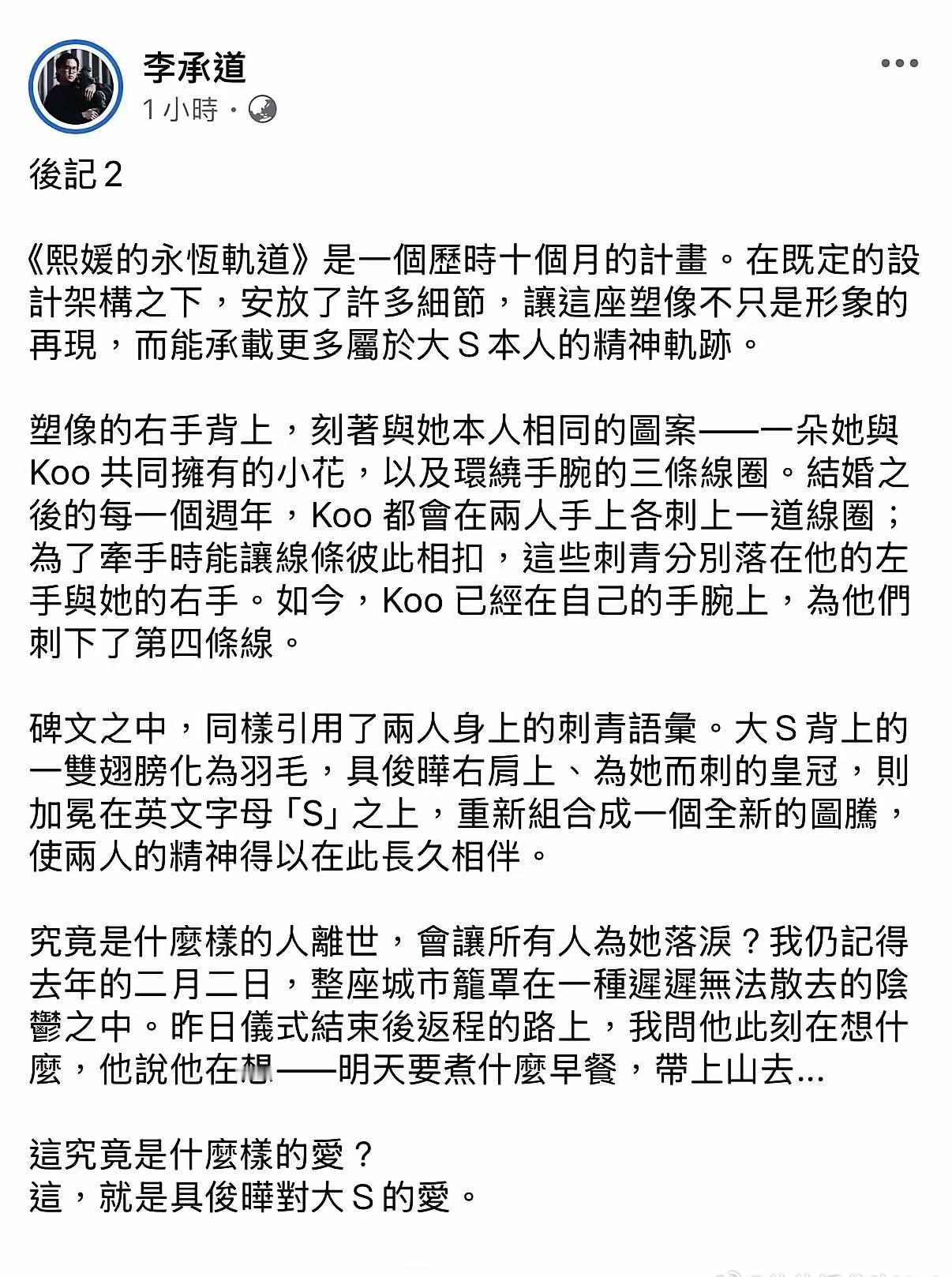 哇!这细节太有心了 原本只注意卡通女孩和大S相貌的差异。没想到看清细节和具俊晔手稿图曝光后,才发现具俊晔真的好爱好爱 熟悉大S的都知道,她右手纹了一朵花,还有三条线圈。这都是她和具俊晔相爱的记录。而最初的画稿曝出,果然那一幅幅画面无一例外都有这两个印记。虽然画的不像,但确确实实就是大S 同样的,大S雕像的右手上依然有这些。世界上没有什么是永恒的,但具俊晔却为大S设计了《熙媛的永恒轨道》这份爱真的很不容易!
