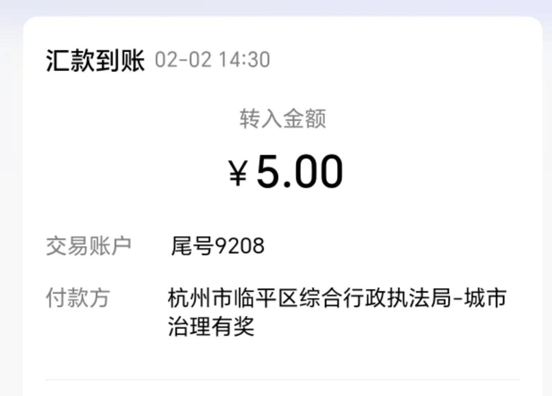杭州的区奖终于到账了! 有一天看到家门口路牌拼音是错的,我就在浙里办 登记了一下,然后这事当下就忘过去了。今天突然临平城管给我打了 5 块钱,一看发现他们居然真改好了。 浙里办 上还有整改现场照片。真的感慨啊,杭州城市治理水平真高。这要是放在老家,改都不会改的[伤心]更别提给你奖励了杭州 城市治理 交通 温暖的城市 注意交通安全 每天都有值得记录的瞬间 我的生活碎片