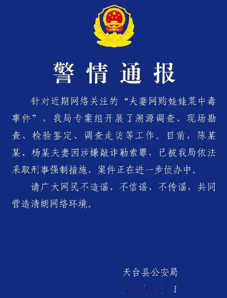 天台警方通报夫妻娃娃菜中毒!陈某波、杨女士涉嫌敲诈勒索罪,已被采取刑事强制措施!夫妻俩合谋自我投毒索赔实锤了!史上最狠夫妻之一,偷鸡不成蚀一万把米!3、5万医药费自己贴,这个年过不成了,两口子肯定坐牢,女儿、父母怎么办!见过各种穷疯的,要钱不要命的,对别人下手的,实在没想到还有这种,对自己下毒下死手的!警示每一个人!生活都不容易,君子爱财取之有道!有胳膊有腿,凭自己双方劳动挣钱!