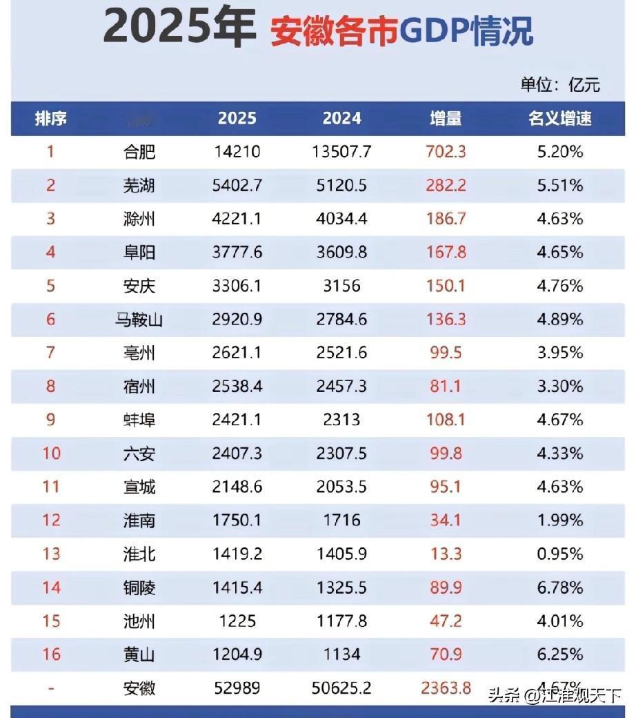 江苏省昆山市在安徽省排名第二,浙江省慈溪市在安徽省排名第6名 安徽省2025年gdp52989亿,全国排名第11名,这个数据放在国内来看,也算还可以的了,属于中等水平。 安徽16个地级市,合肥超1.42万亿,芜湖5000亿级别,滁州4000亿级别,阜阳,安庆3000亿级别,马鞍山,亳州,宿州,蚌埠,六安,宣城2000亿级别,淮南,淮北,铜陵,池州,黄山1000亿级别。 全省所有地级市都在1000亿以上。 安徽省隔壁的江苏省和浙江省经济实力太强悍了,江苏排名第一的县级市昆山市数据5615.34亿元,在安徽可以排名第二,仅次于合肥,排名在芜湖之前。 浙江省排名第一的县级市慈溪市,数据3013.9亿元,在安徽排名第6名,位置在合肥,芜湖,滁州,阜阳,安庆之后。 昆山市,属于苏州市代管,面积931平方公里,人口216万。 慈溪市,属于宁波市代管,面积1361平方公里,常住人口189万人。经济百强县市 苏州昆山经济 昆山经济腾飞 长三角gdp 县级城市gdp 昆山gdp 昆山经济