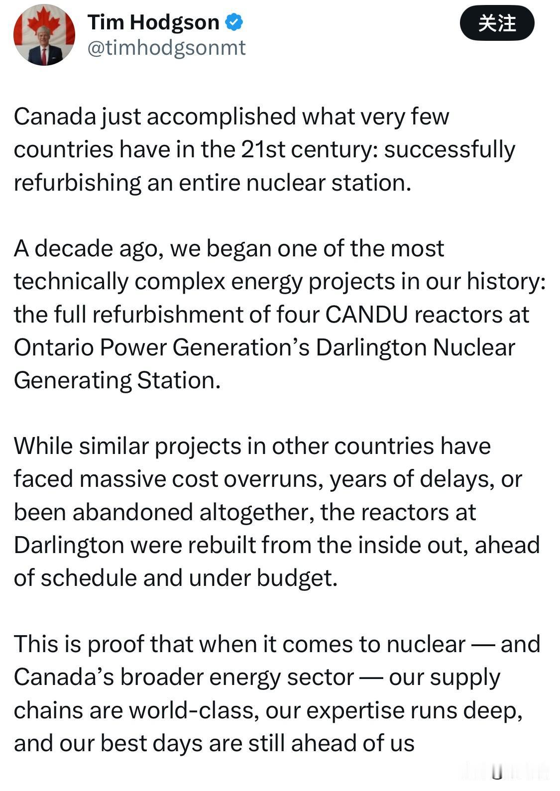 加拿大安大略电力公司(OPG)在 2026 年 2 月初正式宣布,位于安大略省克拉灵顿的达林顿核电站(Darlington Nuclear Generating Station)翻新工程已全面完工。 这是全球目前规模最大的核电站翻新工程,共涉及 4 座 CANDU 重水反应堆的彻底更换和升级。该工程不仅比原计划提前 4 个月完工,且最终支出比 128 亿加元的预算还节省了约 1.5 亿加元。在大型基础设施项目,尤其是核电领域,这种“不超支、不延期”的情况极其罕见。 翻新完成后,达林顿核电站的运行寿命将延长至至少 2055 年,为安大略省约 350 万户家庭提供未来 30 年的零碳电力。 国产化率高: 该项目的设备和技术有 96% 实现了“加拿大制造”,展示了加拿大在 CANDU 技术链上的深厚实力。 预计在核电站接下来的运行周期内,将为安大略省带来约 900 亿加元的经济效益。 此次成功为加拿大后续的核能计划注入了信心。目前,加拿大正着手对皮克林核电站(Pickering)进行类似的翻新,并计划在达林顿场地部署该国首个商用小型模块化反应堆(SMR)。
