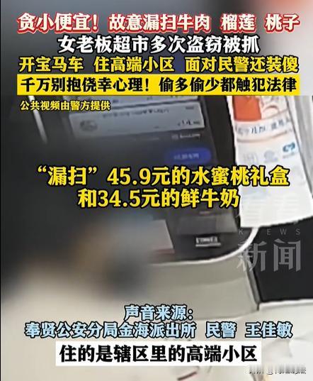 一女子自己做老板,家庭条件非常好,开宝马、住高档小区,但是就是手心痒痒,想要去“偷盗”。到超市里购物,经常故意漏扫物品,超市梳理出证据,前后一共8次,发现这位女士故意顺走物品,包括牛肉、榴莲、桃子等。虽然价格不是很高,但是次数已达标,放着好的生活不过,这下进去也够她喝一壶了。 看看新闻2月3日报道了这则新闻。 据报道称,一开始办案人员照例询问,女子态度很正直:“别乱说啊,我可没有偷!”直到出示了证据,女老板哑口无言,开始心虚,但是现在后悔也来不及了。 什么是有钱人,有钱人不仅有钱,还得有气质、有素质、有教养,如果没有了道德,钱再多,也惘然。 一位女老板,自己还是做生意的,应该知道做生意要讲诚信。不知道她在其他场所有没有犯下盗窃案,但是在超市里,却屡屡犯罪。 每次这位张女士(化名),前往超市购物的时候,都是开着自家的宝马车过去,然而,开着宝马,可不意味着她就是高档人,看看她做的事情。 采购完物品,张女士不喜欢到人工收费区域,她很喜欢到自助收银处,自己扫码付钱。 每一次手里的货品,她都会故意漏扫几样东西。这一次,她漏扫牛奶、下一次,漏扫牛肉,再下一次,可能就是一份水果。 张女士每次都是神情很淡定地做完这件事,可能心想:要是真的被抓到了,我就说看漏了呗。 但是,这样的言语,可以搪塞过法律吗? 超市工作人员也注意到了张女士,因为她不止一次作案。前后一共有8次,这是查询到的,不知道其他是否还有遗漏。 而且经过查询发现,张女士每次都是开着宝马车子过来购物,看着也不像是没钱的人,但是着实是个爱贪小便宜的人。 经过搜索车牌号,确定了张女士的去向,再整理出她作案的经过,超市负责人立刻就报了警。 办案人员掌握到证据之后,开车前往张女士家中拿人。刚进小区,办案人员则感叹道:看吧,住着高档小区,开着高档车,却还要做如此违法的事情。 敲开门,正好就是张女士开门。一开始,她有些迟疑,还不知道自己所做的事情,已经被侦查出来。 “你好,你涉嫌盗窃了!”办案人员先跟张女士交代了来意。而面对工作人员的指认,张女士则一脸正义的说:“什么?你们搞错了吧?” 办案人员则出示了相关证据,这个时候可以看到,张女士的脸色越来越难看,表情也越来越心虚。 “根据超市负责人的整理发现,您前后一共8次前往超市盗窃,支付的时候,故意漏刷,这些都是监控画面材料。”当办案人员把证据展现在张女士面前时,她羞愧的低下了头。 最后张女士也只能后悔的说:“全是我贪小便宜,是我的心态作祟害了自己!” 张女士因为涉嫌多次盗窃罪,最后被刑事控制,案件还在进一步的调查中。 本案释法:女子到超市购物,结账时故意漏刷,前后一共8次犯案,金额不高,但是次数比较多,女子的行为将会面临怎样的处罚呢? 根据《刑法》第二百六十四条规定,构成盗窃罪的情形,不仅仅局限于“数额较大”,还包括多次盗窃、入户盗窃、携带工具盗窃、扒窃等行为。 如果在两年之内,盗窃数次达到3次以上,不管盗窃金额多少,均构成盗窃罪。 从这个新闻中,可以看到张女士的做法:前后一共8次,故意非法、漏扫、持续故意占有超市的公私财物,这个行为具备非法占有性,主观恶意明显,符合“以非法占有为目的,秘密窃取公私财物”的构成要件。 即便张女士每次只盗取水蜜桃、牛奶、牛肉等等,但是却会因为“次数多”而达到刑事立案。 当触碰“盗窃罪”的法律红线,则会面临3年以下有期徒刑、拘役或者管制,并且还要处以罚金。 之后在审定的时候,会结合作案的次数、动机、累计总金额、悔罪表现、退赃情况等等来综合判定最后的刑罚。 然而不管怎样,张女士的犯罪行为已经很明确,之后就要看她的认罪态度,综合判断。至少也是在3年内的刑期,实在是得不偿失,非常可惜。 对于此案,您怎么看呢,不妨一起来讨论吧!