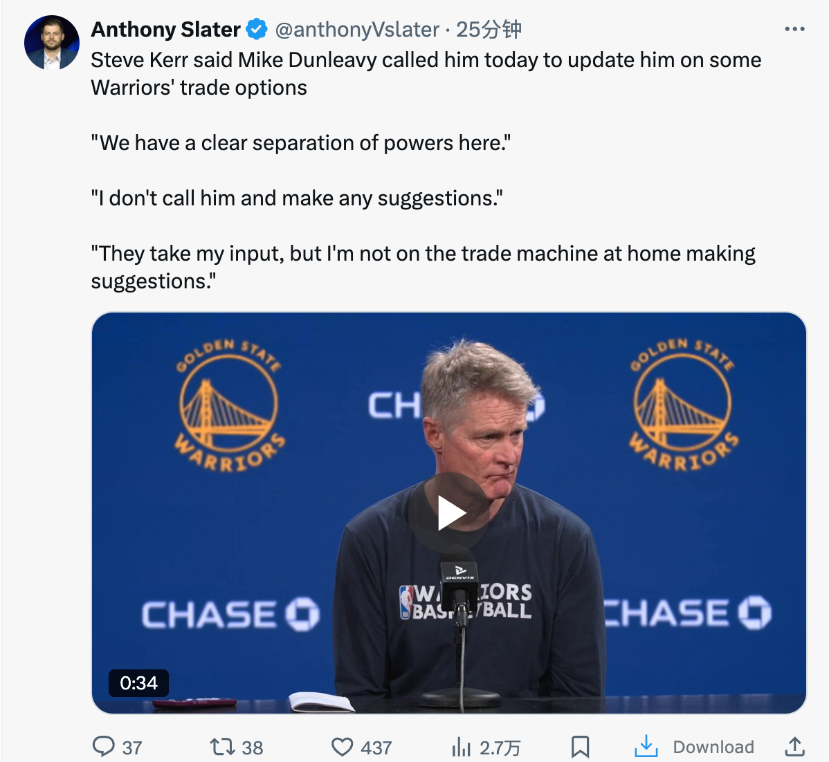 科尔说今天迈克·邓利维今天给他电话沟通勇士队交易方案“