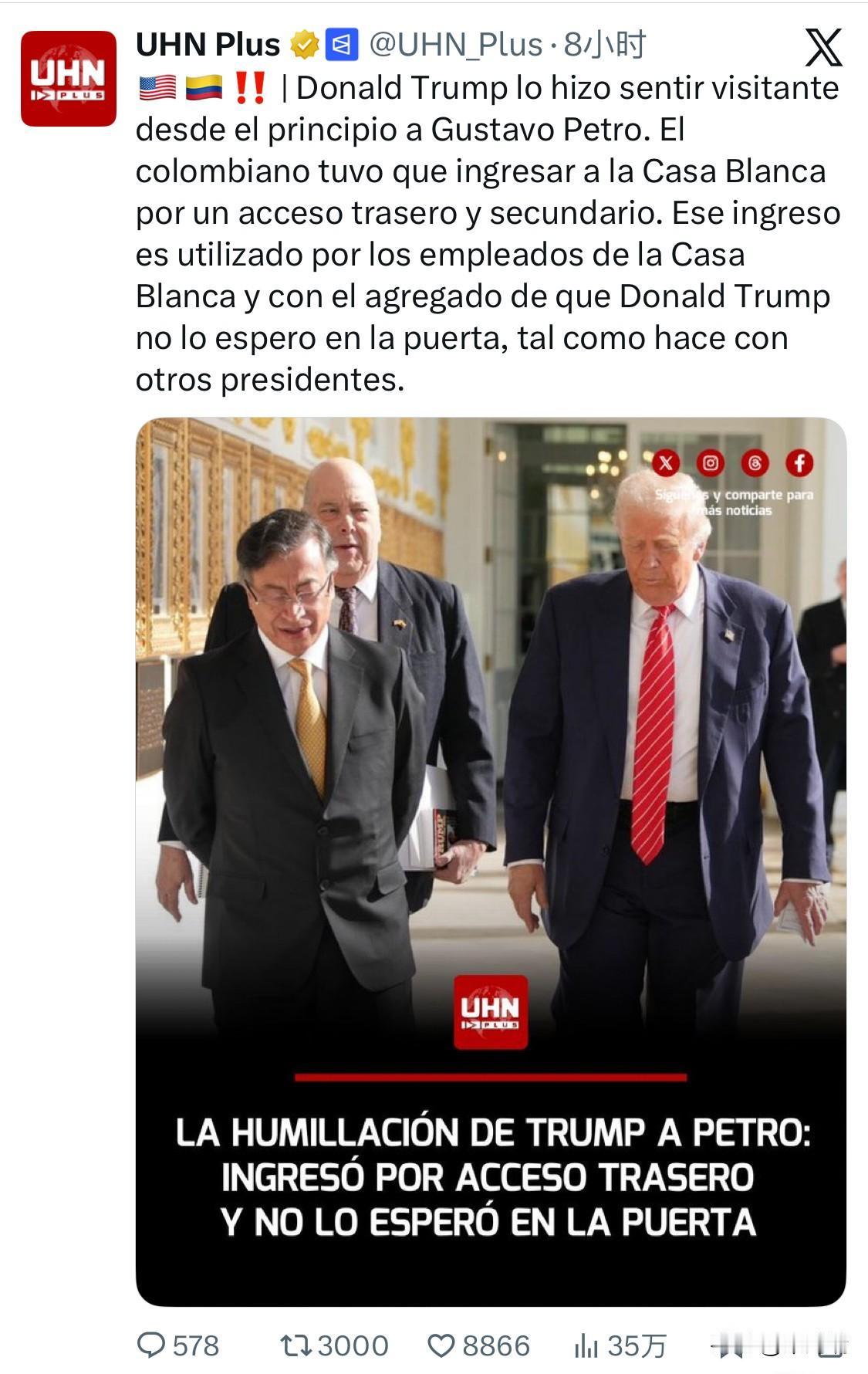 当地时间 2026年2月3日,哥伦比亚总统古斯塔沃·佩特罗(Gustavo Petro)在华盛顿白宫与美国总统唐纳德·特朗普进行了历史性会晤。 从一开始,唐纳德·特朗普就让古斯塔沃·佩特罗感觉自己像个客人。这位哥伦比亚总统不得不从白宫的后门进入。这个后门是白宫工作人员使用的,更糟糕的是,唐纳德·特朗普并没有像对待其他总统那样在门口迎接他。 两人在白宫椭圆形办公室进行了持续约 2 小时的闭门会谈。此次会晤极大地缓解了两国近一年来的紧张关系。此前,特朗普曾指责佩特罗政府放任可卡因流入美国,并一度威胁要对哥伦比亚采取行动;而佩特罗则曾批评特朗普的移民政策及美方在委内瑞拉的行动。 特朗普赠送给佩特罗一顶红色的“MAGA”帽子,并在上面签名。 佩特罗随后在帽子上用笔做了修改,将口号改为“让美洲再次伟大”(Make the Americas Great Again),强调美哥两国应在相互尊重的基础上实现繁荣。 特朗普还赠送了一本签名的《交易的艺术》(The Art of the Deal),并在赠言中称赞佩特罗“你很棒”(You are great)。 讨论的主要议题 打击贩毒:双方达成一致,将共同努力减少哥伦比亚流向美国的非法毒品。特朗普在会后表示两国在毒品管控问题上取得了“积极进展”。 能源与地区局势:佩特罗提议通过哥伦比亚出口委内瑞拉天然气的可能性,并讨论了解决委内瑞拉局势的潜在方案。 移民问题:作为特朗普的核心政策议题,双方探讨了通过区域合作管控非法移民潮的措施。 各方反应 官方评价:特朗普称赞佩特罗“非常了不起”(terrific),并表示两人“相处得非常好”。佩特罗则在会后表示,这次会晤具有“建设性”和“乐观”的基调,为两国关系开启了“新路径”。 民众反应:在白宫会晤的同时,数千名佩特罗的支持者在哥伦比亚首都波哥大的玻利瓦尔广场集会,表达对政府外交政策的支持。