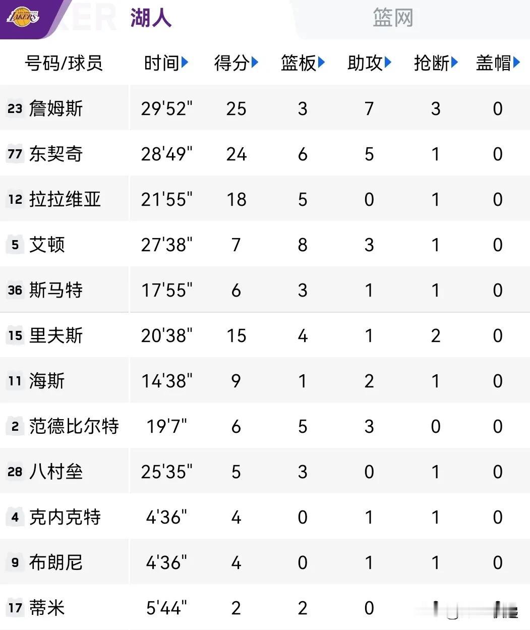 125-109大胜篮网!对于湖人球迷来说,今天是4倍快乐的一天! 首先是排名上升,拿下篮网后,湖人战绩30胜19负,胜率超越森林狼(31胜20负)升至西部第五。 其次是拉近与西部第三的差距,掘金今天输给活塞后,战绩跌到33胜18负(依然排名西部第三),原本与湖人之间的3个胜场差如今缩小到2个,换句话说湖人就比掘金多输一场而已,这让全员健康的湖人看到了杀进西部前三甲的希望。 第三是连续缺席19场的里夫斯终于迎来复出(替补出场20分38秒,拿下15分4板1助2断,罚球10中8),湖人目前基本全员健康,这对于赛季下半程的冲刺至关重要。 最后是关于净胜分,本赛季湖人倍受诟病的场均净胜分在这场比赛后又有了一定的增长,本场前,湖人场均净胜分在东西部前八的16支球队中排名垫底,这场大胜可以让这项数据上涨一截。