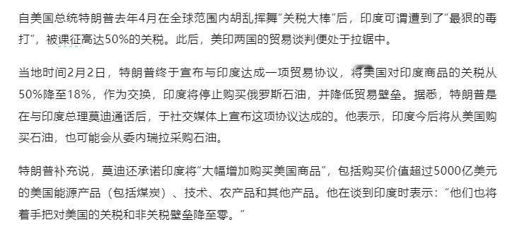 当地时间2月2日,特朗普在社媒宣布,美国降低对印度的关税支配比例,从将近五成压到18%。而印度则断掉与俄罗斯的能源合作链,增加从美国进口石油。换句话说,印度再一次背刺了俄罗斯,而俄罗斯马上坐不住了——俄国防高层动身访华,公开表示要加强中俄之间的相互支持。 事情如果只看表面,像是一份被动承受的经济谈判结果,印度拿到好处,自然也要付出代价。但细究过程就会发现,这根本就是一场有预谋的套壳游戏。其实早几个月,美国就放出风声,要根据“地缘政策稳定”来重新设计亚洲能源结构。而能被设计的国家,有野心、有地理优势、有经济压力的印度,就是首选。 特朗普这次并不藏着掖着。他干脆摊牌说,关税优惠是交换条件,只要印度愿意退出俄罗斯的油源线路,那美国能提供足够的能源替代,甚至愿意拉上委内瑞拉一起参与。换句话说,美国想做的,不光是拉走一个买家,更是重新布局能源金融圈,彻底把俄罗斯从核心市场踢出去。 而对印度来说,确实到了要重新押宝的时候。在欧洲逐渐衰退、国内制造业缺乏突破的当口,美国市场就成了他们最大的消费出口池。当前贸易流向的重心越往美洲偏,印度与西方的商业利益就越密切。所以对印度政府来说,这笔账虽然代价高,但撇下情义,可能更靠近他们想要的战略自保。 俄罗斯的难题就在这里了。本来还想借着印度继续输送资源,平衡一下不断收紧的出口范围,现在说断就断。能源作为俄罗斯的重要战略武器,这一下等于被人从后面接了一刀。在欧洲计划三年内终止依赖俄罗斯能源的背景下,印度这一转向,几乎压断了莫斯科往外输出的第二块跳板。 也正因为如此,俄罗斯马上找上中国。一来是缓压情绪,二来也是真切担忧。当意识到中印之间也存在边界对抗后,印度对俄罗斯政策的转变,不止是经济倒向,更是政治上的转身。之前还能靠传统盟友的情分吆喝几声,现在连基础信任都摇晃了,这种转变预示着:中俄需更快打通彼此的战略通道。 但别着急把问题都摊给印度,它只是棋盘中一个顺水推舟的棋子。真正下套的还是美国。特朗普从头到尾要得就是这个局面——打乱中俄的协调节奏,让原本可以组成多极对抗的国家之间自己先瓦解。他的目标不是简单让俄罗斯失血,而是进一步把能源问题和制裁体系捆绑在一起,把压力全部甩给中俄。 不仅如此,不远的中东也没省事。美国一边怂恿以色列跟伊朗死磕,一边在背后插手伊朗周边局势,说穿了,还不是为了石油动脉。要搞定伊朗,能源就能一锅端。现在中俄才刚稳住对伊朗的合作,美国那边已经开始动印度,是要从亚洲东部绕到西端,把资源网络彻底打乱。 再联想一下现在的态势:日本帮着撬动科技供应链,韩国被安全条约牵着走,印度投入美式市场游戏,东南亚有的国家矿产已被预定;看得出来,美国是玩真的。一步一步消耗掉中俄之间本能共享的资源窗口,最后就是把战略被动甩还给两个大国。 说到底,印度的“背叛”和特朗普的“胜利”,是同一个动作表面与背后的呈现方式。如果认为这只是经贸变化,那就错判了现在的国际环境。这本质上正在剥离一个多边协调时代的根架,让单边强权重新刷版图。 也有不少人还在美化印度的“多边平衡”,可现在的动作证明,它的平衡天秤其实早就偏了,一旦遇到现实利益诱导,方向并不会站在谁温情的历史上,而是站在眼前账目的合算表上。 这次变动看着让俄罗斯焦虑得发冷,但真正要警醒的还是中方。全球博弈已经不再局限在几个大国间敲锣打鼓的较量,而是在边缘国家争先恐后站队的混战中见分晓。能源是表,地缘是里,意识形态和控制力是骨架,看似平静的外交辞令后,真正比拼的是国家对局势的反应力和补位速度。 还是那句话,别低估每一次市场风向改变背后的战略算盘。现在该问的不是“印度是不是倒戈”,而是该认清“这场围绕资源与地缘的全球对抗,才刚刚开始”。