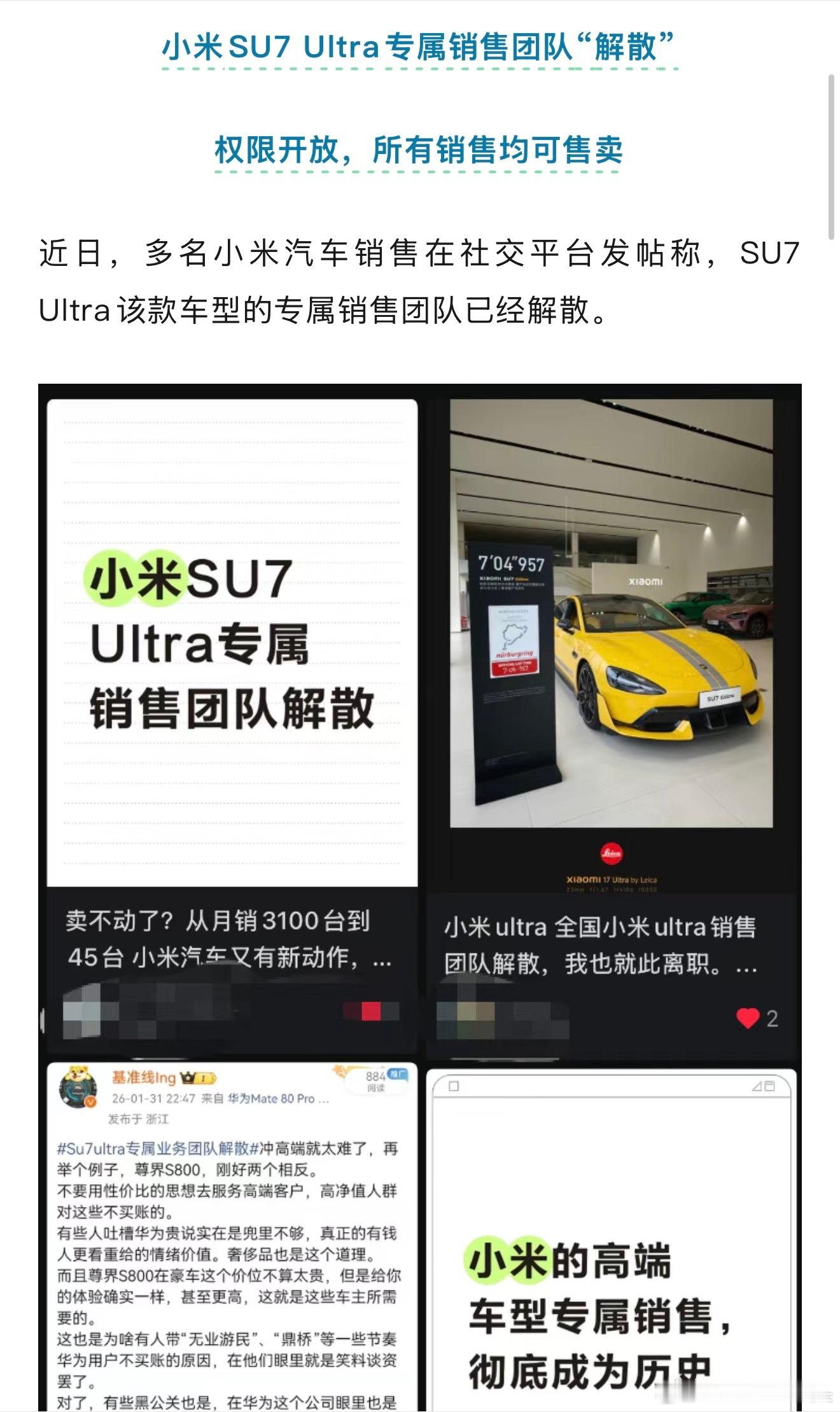 条件:1.宝马M在国内有受众,卖的还行2.奔驰AMG在国内有受众,卖的不错3.奥迪RS在国内有受众,你别管是一手还是二手结论:高性能运动车型国内有受众,可以组建专属销售团队。但是……上面这些的受众可能就是同一波人啊这些燃油性能车的拥趸大部分还未必接受电车性能车呢。而新生代的电车性能车第一波受众撑得起销售团队,后面的销量就跟不上了Su7ultra专属业务团队解散