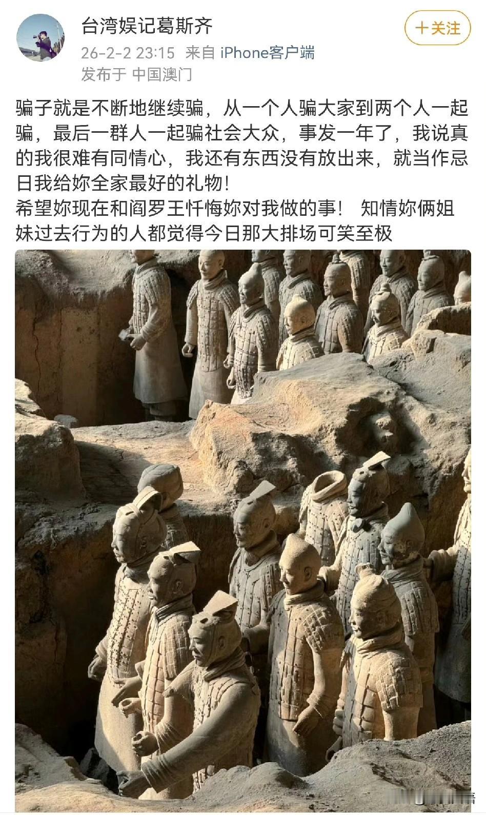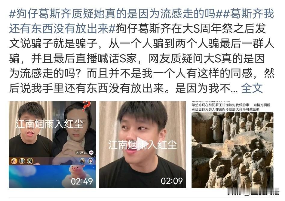 🌙狗仔葛斯齐,喊话S家! 2月2日,大S徐熙媛离世一周年纪念仪式落幕,S家全员齐聚悼念,场面看似肃穆温情。没人料到,仅过一天,狗仔葛斯齐就突然发难,在社交平台发文怒斥S家“骗子扎堆”,还直言自己手里还有未放出的猛料,一句话再度搅动舆论漩涡。 这不是葛斯齐第一次针对S家发声,早在大S猝逝之初,他就曾暗示事情不简单,只是当时碍于逝者颜面和两个孩子,没有过多爆料。如今周年祭刚过便再度喊话,难免让人猜测,他口中的“猛料”,或许会彻底推翻此前公布的死因说法。 回顾大S离世的官方说法,2025年2月2日,她在日本因甲型流感并发肺炎,经14小时抢救无效,最终因多器官衰竭离世,从发病到去世仅用了4天时间。当时这一说法虽引发少量质疑,但随着S家低调处理后事,舆论逐渐平息。 可葛斯齐的接连喊话,让尘封一年的疑问再度浮出水面——大S真的是单纯因流感离世吗?更让人疑惑的是,有急救医师发现,大S生前最后露面时,手臂上有多处可疑针孔,家属称是治疗流感的常规操作,却难以说服专业人士。 除了针孔疑点,大S在日本猝逝后的一系列操作也充满争议。按照台湾地区规定,意外离世需由检察官介入调查,所有医疗记录都会公开,可她去世不到一天就被火速火化,远超日本要求的3天内火化的规定,这般仓促难免让人多想。 有网友梳理细节发现,大S当时在日本的就医过程十分曲折,1月31日被救护车送往当地医院,治疗后半夜被送回住处,次日转诊大医院确诊流感,最终在计划返台途中突发心脏骤停。期间是否存在延误治疗的情况,始终没有明确答案。 更值得玩味的是,葛斯齐此前与S家还有过旧怨,他曾因爆料小S相关事件,被法院判决赔偿60万元新台币,有人猜测他此次喊话是为了报复,也有人认为,若没有实锤证据,他不会贸然多次针对逝者家属发声。 韩国在2月4日播出的大S周年特辑中,披露了更多临终细节,称她病重期间反复念叨“想回家”,丈夫具俊晔一路搀扶,可这些温情片段,却被网友质疑是“立人设”,毕竟特辑中诸多细节未经原始病历证实,存在叙事加工的可能。 此外,S家在大S离世后的诸多举动都充满矛盾。大S生前居住的豪宅每月电费天价,可她去世后,S家却以“环保”为由计划树葬,被邻居投诉后又改为骨灰寄存,反复横跳的操作,更让外界的质疑声不断放大。 还有传言称,大S生前长期受基础病困扰,不仅有先天性二尖瓣脱垂、妊娠毒血症病史,还曾被曝有癫痫问题,免疫力远低于常人,这些基础病是否与她的离世有关,S家始终没有正面回应。 此前大S抢救期间,有网友爆料小S与S妈曾发布跳舞视频,被质疑漠视亲人病情,当时S家未作回应,如今葛斯齐再度喊话,或许会将这些未厘清的疑点一一揭开。他曾明确表示,不爆料是看在孩子的面子上,这是他最后的底线。 随着葛斯齐的喊话发酵,网友的猜测愈发多元,有人认为他只是想蹭热度、报旧怨,也有人坚信他手里有实锤,是想揭露真相。截至目前,S家依旧保持沉默,既不回应质疑,也不反驳葛斯齐的言论。 值得注意的是,大S的遗产分配和子女亲权问题,也曾引发诸多讨论,汪小菲作为孩子的生父,此前就因亲权归属与S家有过拉扯,而葛斯齐的猛料若涉及家族利益,或许会牵扯出更多不为人知的隐情。 有知情人士透露,葛斯齐此次之所以选择在周年祭后发声,是因为不满S家一直用“深情”人设掩盖真相,还试图通过高调举办纪念仪式、打造纪念碑等方式,彻底平息外界质疑。他的隐忍,或许只是在等待合适的曝光时机。 如今,葛斯齐已经放出狠话,却迟迟没有公布具体猛料,这种“只喊不放”的操作,让舆论分成两派,有人觉得他是“狼来了”,也有人认为他是在等待最佳时机,避免打草惊蛇。 大S的离世,原本该随着时间逐渐被淡忘,可葛斯齐的接连喊话,让越来越多的疑点浮出水面。从可疑针孔到仓促火化,从延误就医的猜测到S家的沉默,每一个细节都暗示着,事情或许远比我们知道的更复杂。 葛斯齐口中的“猛料”究竟是什么?大S的真实死因是否另有隐情?S家仓促火化、拒绝回应的背后,到底在掩盖什么?这些疑问,或许只能等他放出全部素材后,才能找到答案。 逝者已矣,真相却不该被掩埋。无论是为了还原事实,还是单纯蹭热度、报旧怨,葛斯齐的喊话都让公众重新关注到这起事件。你觉得葛斯齐手里真的有猛料吗?大S的死因是否另有隐情?不妨留下你的观点,一起讨论。