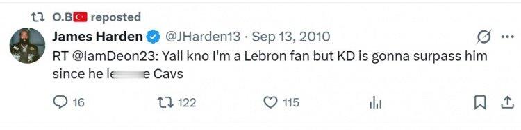 恭喜哈登加盟偶像詹姆斯的球队!詹姆斯-哈登2010年9月份发推:“你们都知道我是勒布朗的粉丝,但自从他离开骑士后,杜兰特将会超越他。”