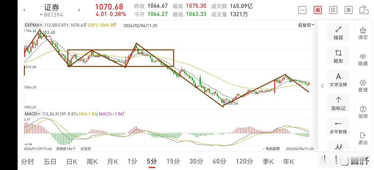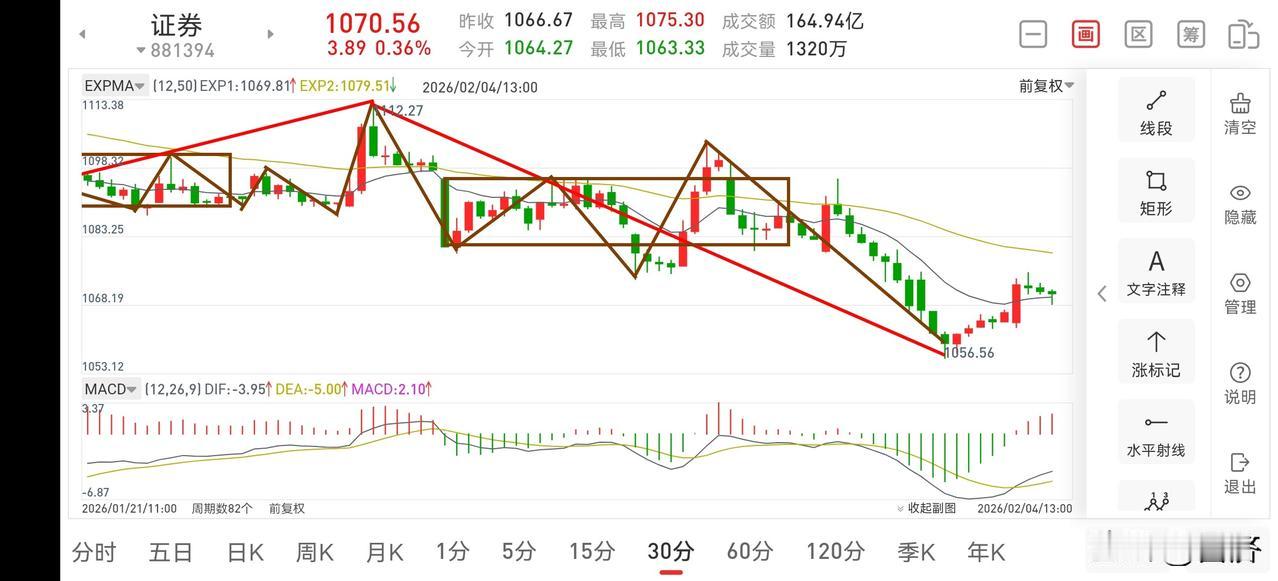 聊聊证券板块(2026.2.4) 证券板块随着昨天的触底反弹,并在日线上收出大长腿,今天早盘有条不紊的向上攀升,完成了5分钟一笔的反弹如图一,目前正在回踩5分钟一笔,由于早盘开盘的5分钟出现了量价异常,这里是要修复的,但并不会回踩很深,从而形成5分钟二买,待二买构建完成后,有望进入上方中枢区间,从而改变5分钟级别的下跌结构。从30分钟图二上看,目前正在向上反弹30分钟一笔,而且macd已经金叉,此笔反弹同样有望进入上方中枢区间,从而改变30分钟级别的下跌结构。如果你想做高抛低吸,那就进入中枢后适当减一点仓位,然后等它回踩不破新低时再回补进去,总体而言,走势无忧,大概率已经开始走转折向上的走势。 商业航天妖龙今天的下跌符合预期,昨天晚上的文章已经做出友情提醒,但回踩就是机会,无需担忧。证券板块动态 现在做券商晚不晚