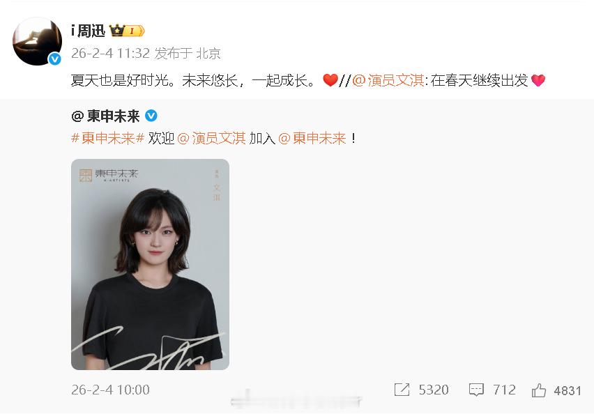 周迅欢迎文淇加入东申未来 “夏天也是好时光。未来悠长,一起成长。”