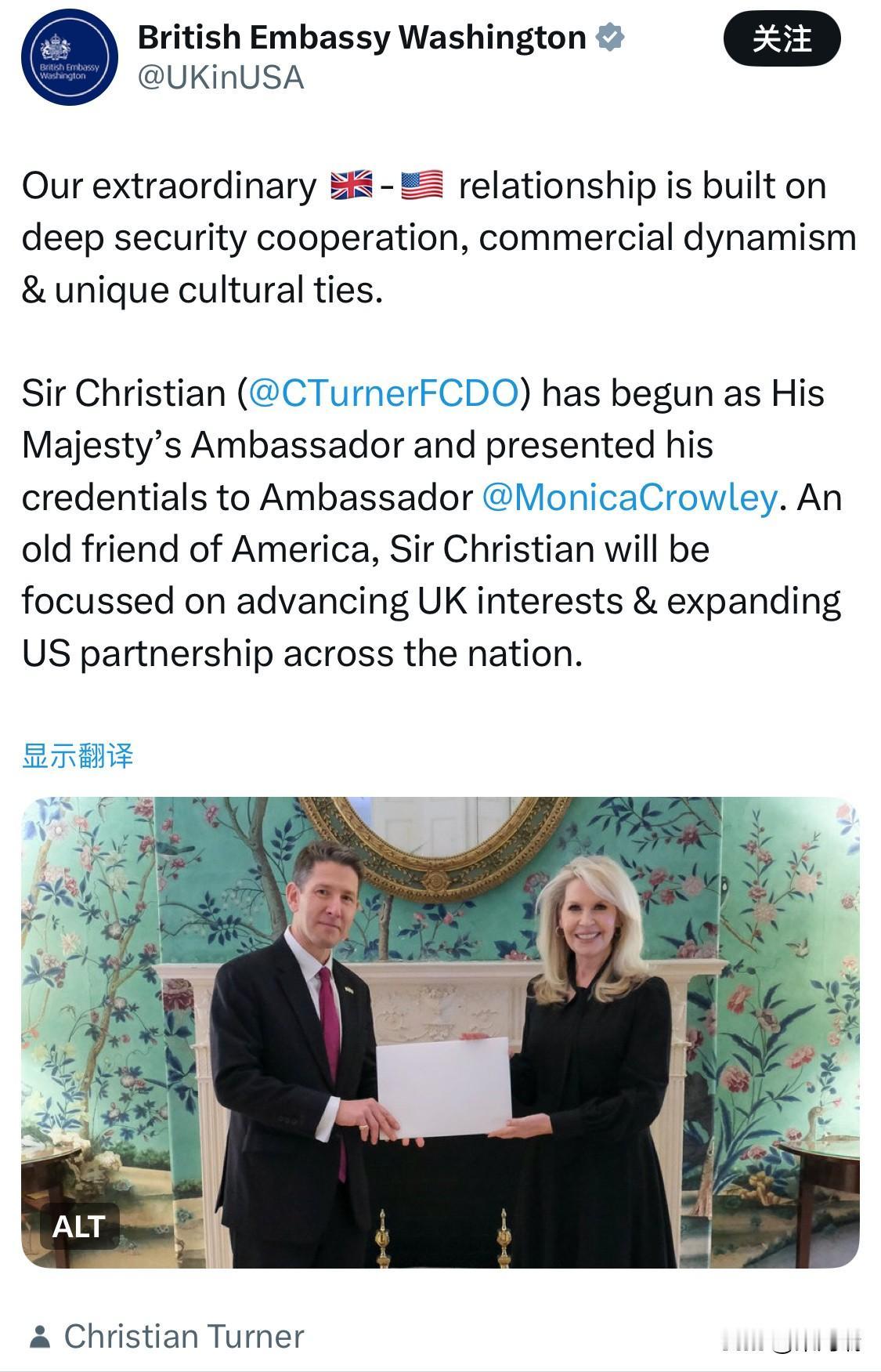 英国新任驻美大使是克里斯蒂安·特纳爵士 (Sir Christian Turner KCMG),他已于 2026年2月2日 正式履新,向美国国务院递交国书并开始行使职权。 主要履历与背景 特纳爵士是一位拥有近 30 年经验的资深职业外交官,其履历跨越了外交部、内阁办公厅及首相府。 教育背景:1972年出生于克劳利,曾就读于马尔伯勒公学,随后在曼彻斯特大学获得博士学位。 近期职务: 2023 - 2025年:担任英国外交、联邦和发展事务部 (FCDO) 的政治总监。 2019 - 2023年:担任英国驻巴基斯坦高级专员。 2017 - 2019年:担任首相国际事务顾问兼副国家安全顾问。 对美渊源:他在 2002 年至 2006 年期间曾担任英国驻华盛顿大使馆一等秘书,对美国事务已有深厚积累。 任命背景 接替人选:特纳爵士接替了因涉及杰弗里·爱泼斯坦丑闻而于 2025 年 9 月被撤职的前大使彼得·曼德尔森勋爵 (Lord Peter Mandelson)。 外交使命:在被临时调往华盛顿之前,特纳原定出任英国驻联合国大使。英国首相斯塔默选择这位经验丰富的职业外交官,旨在应对当前变动的跨大西洋关系,特别是加强与美国政府在经济、安全及地缘政治领域的联系。