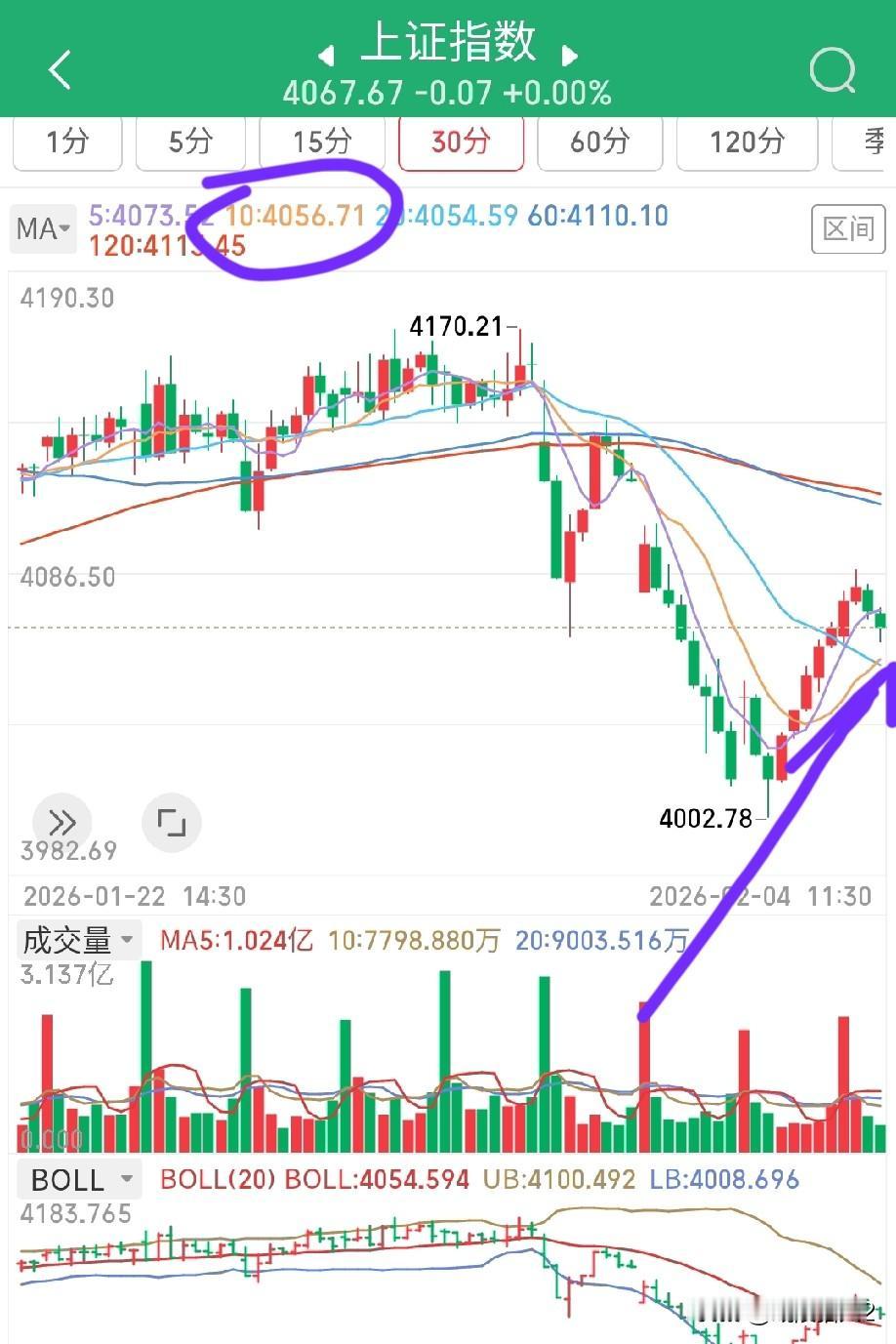2月4日手评。两市上午冲高回落,上方套牢筹码抛压较重,早盘一波跳水很伤人气,按这这种跌法,大盘指数将会引起恐慌踩踏。好在三驾马车启动,银行一直走得较强,券商和保险走势乏力。但临近午盘结束,券商开始启动,指数趋稳。 市场走势与预期相符,底部区域必有反复震荡,不洗去浮筹,市场不会真正走强。估计这种震荡调整还需时日,指数磨底是一件很煎熬人的事情。 今天光伏和商业航天板块还是比较强势,连续上涨之后,此处不宜追高。下午看4060点的支持力度(图1),如果顶得住,指数还会去攻击4100点,如果撑不住,则60分钟和120分钟结构还有一波E浪下跌。沪指会再次去考验4000点形成双底结构。从今天超哥启动三驾马车护指数动作来看,管理层可能也不想跌得太深了。或者说至少在这里要构筑一个中继平台,即使跌也不能跌得太快。 今日行情,多看少动。个人观点,不构成投资依据,不喜勿喷。祝大家下午好运。